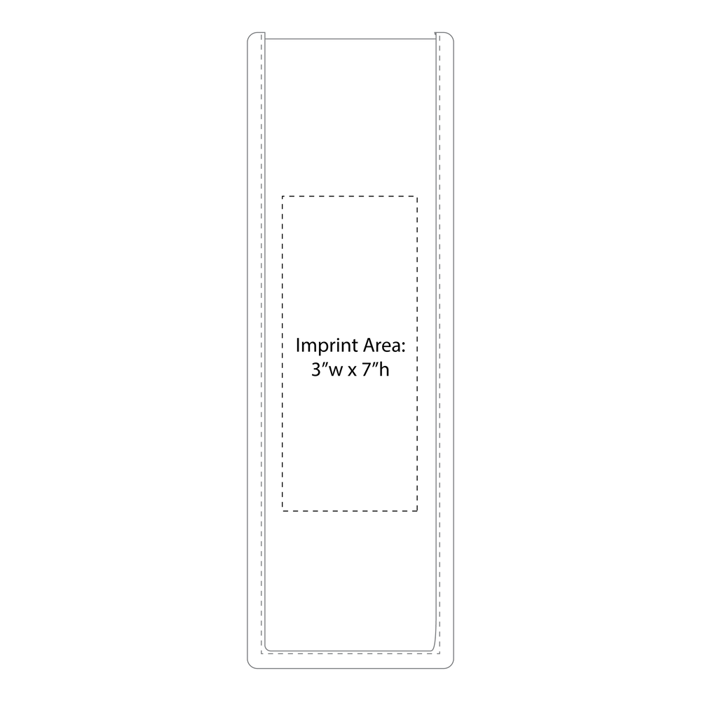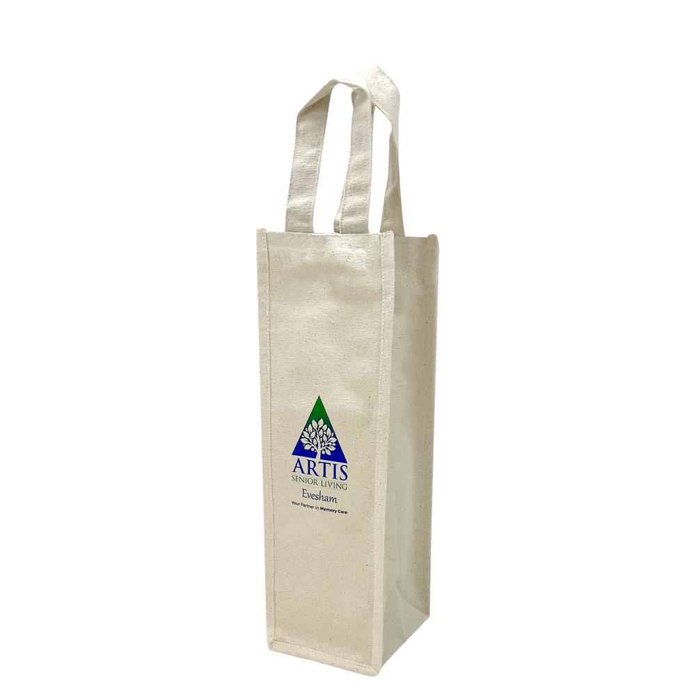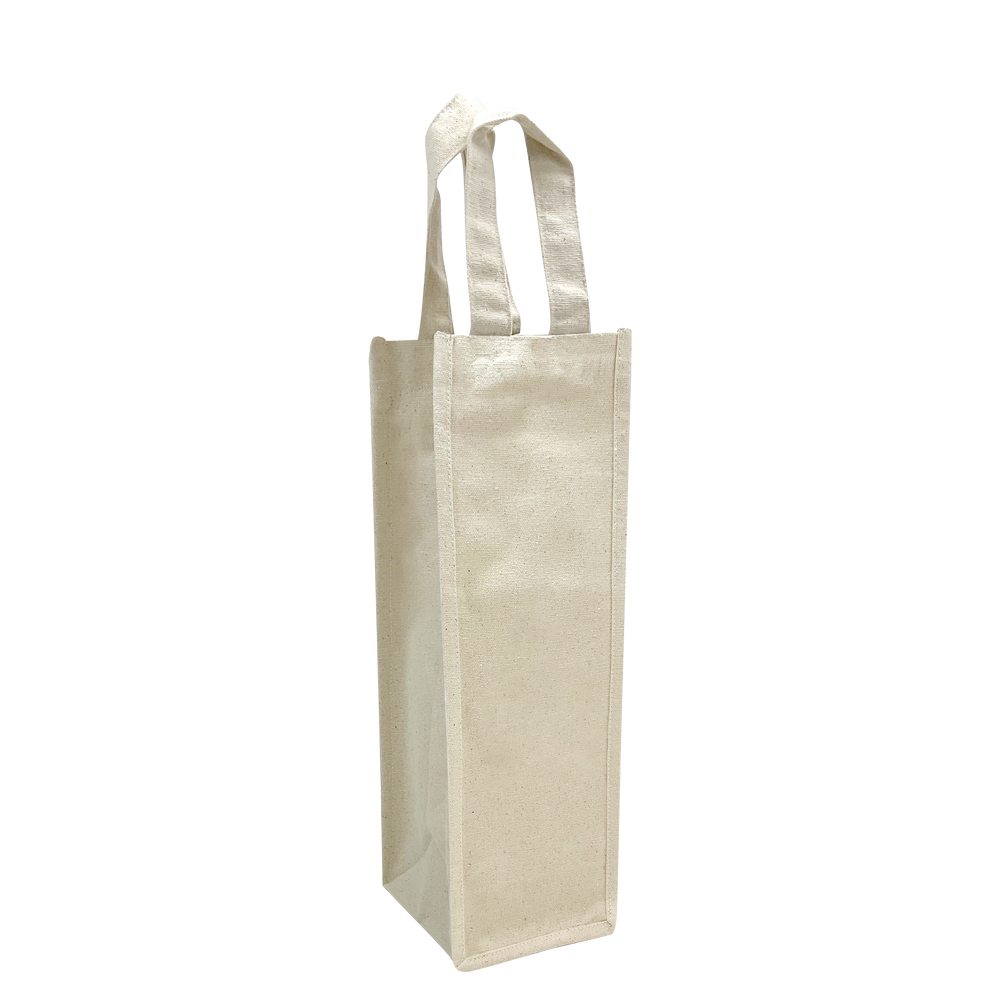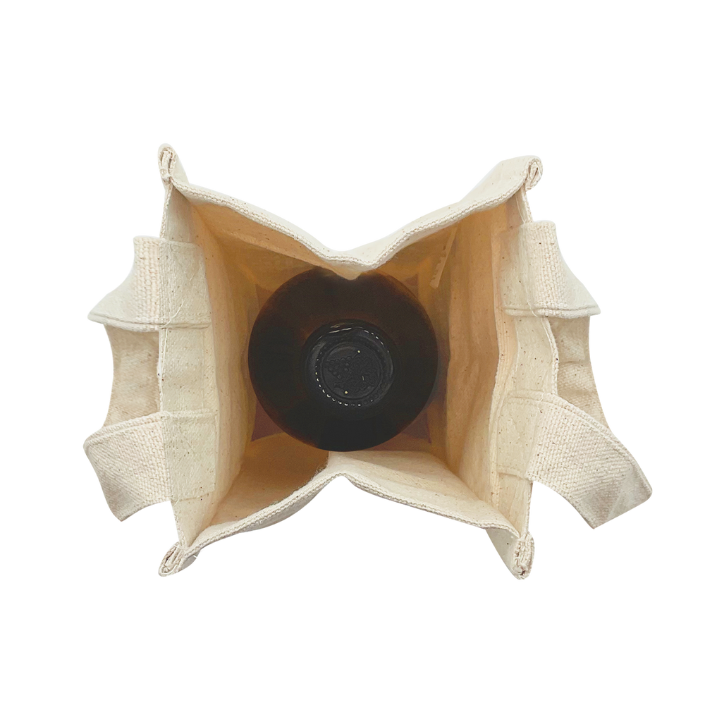 This durable all-natural cotton canvas tote measures 4.5” W x 14” H. It is the perfect size for holding a single wine bottle and protecting it from spills and breaks.