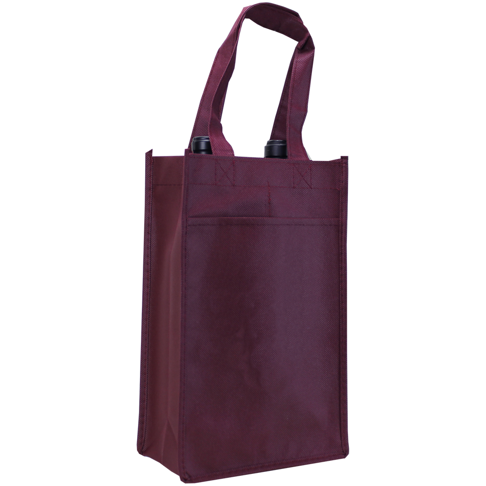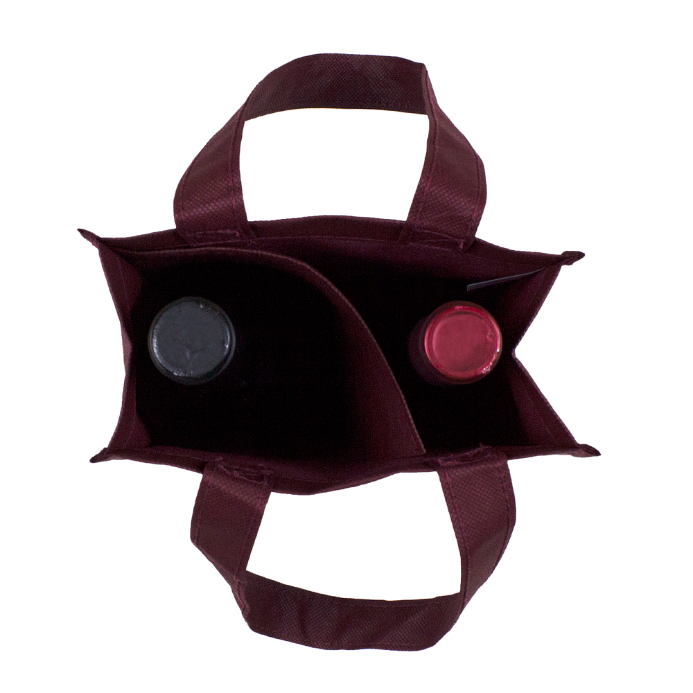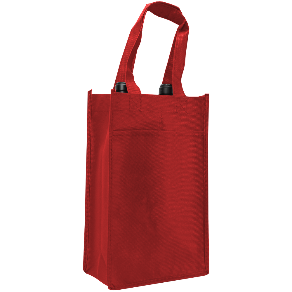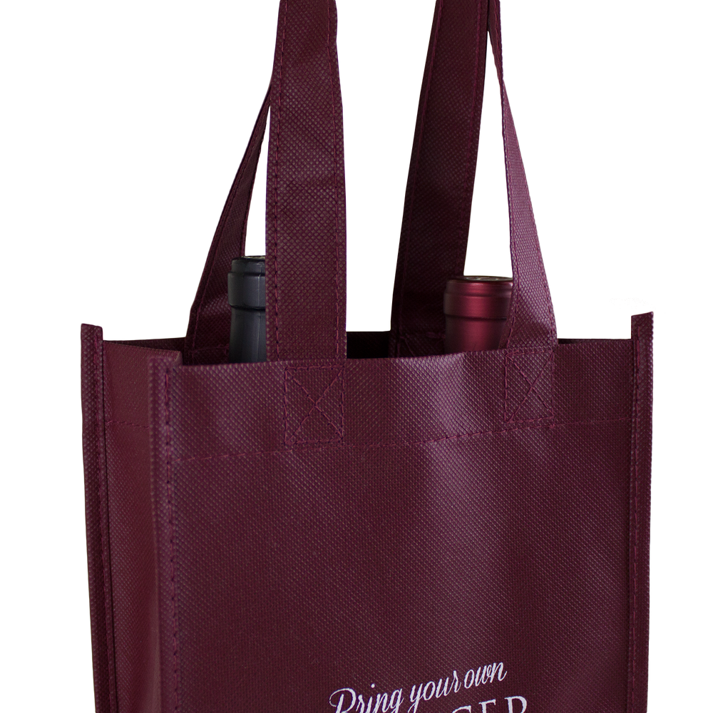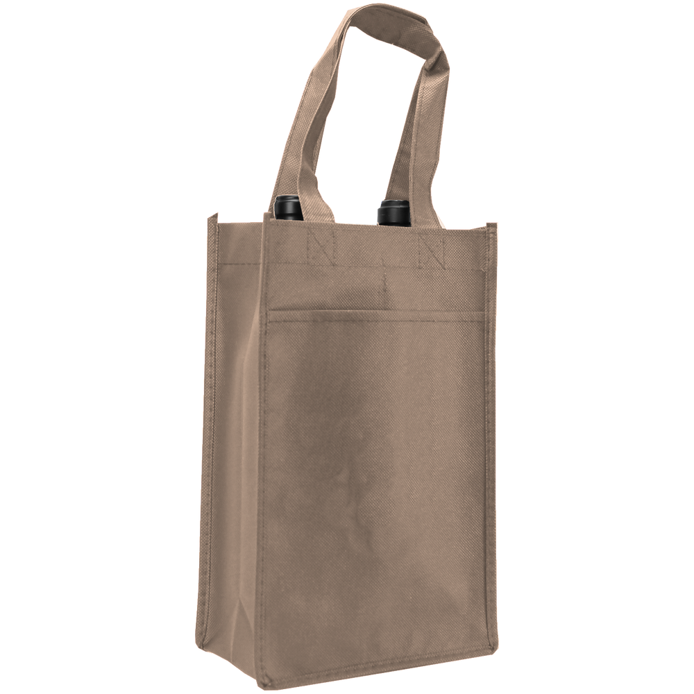 Our two bottle wine tote is a great - in between - tote when thinking 4 is too many and 1 is too little. This two bottle wine tote fits two bottles of wine and also a pocket on each side perfect for pamphlets, literature, receipts, or a simple thank you card.