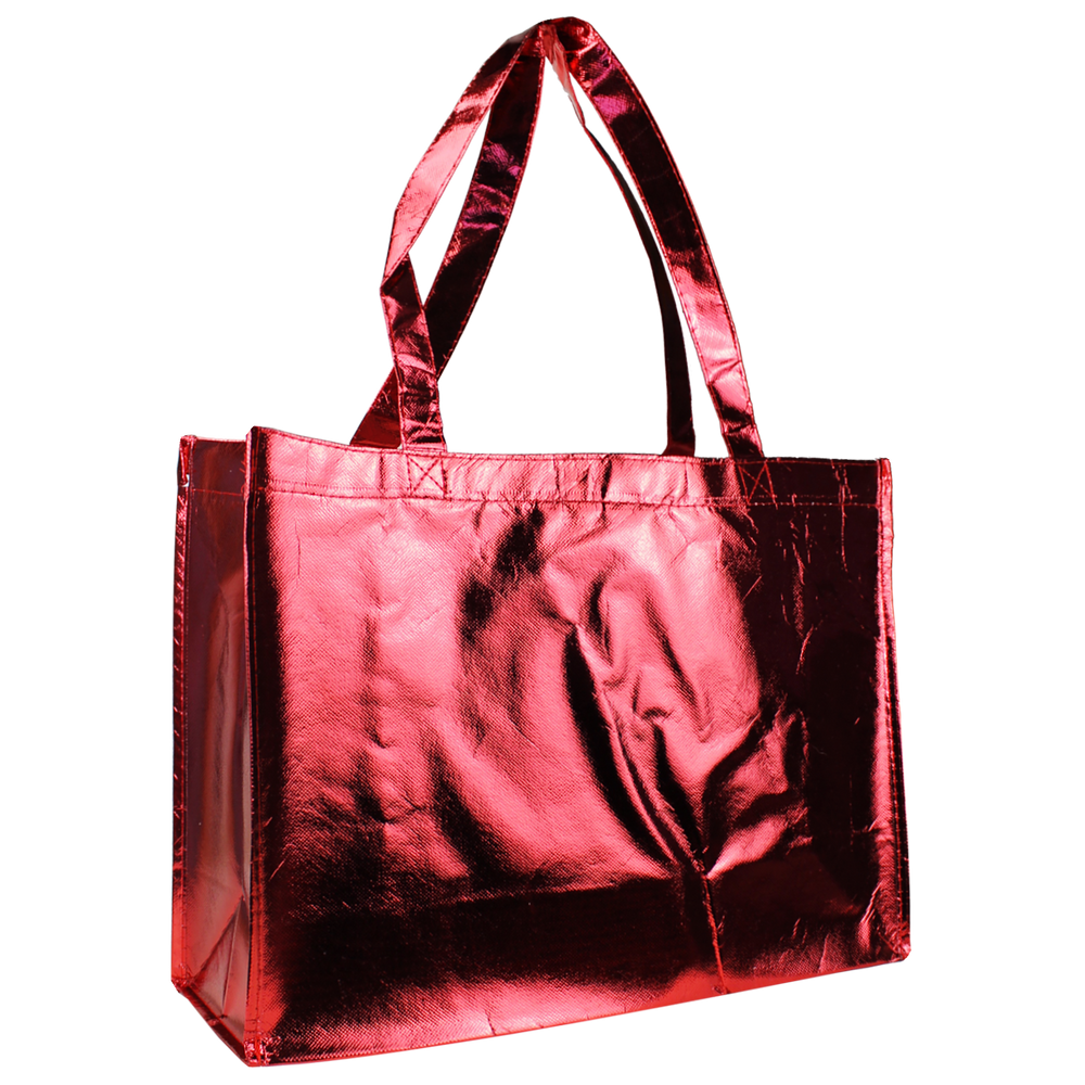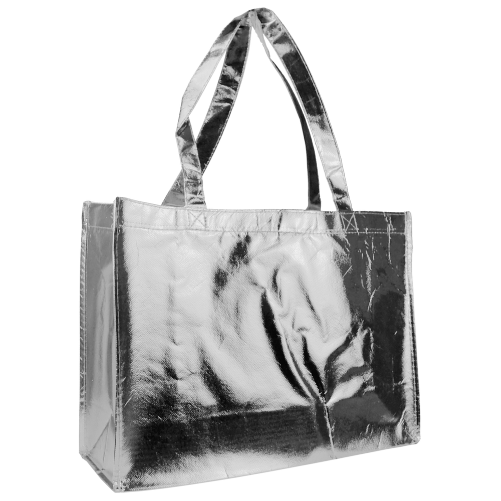 Get ready for tradeshows, conventions, and more with this customizable 16" W x 12" H bag. Available in a variety of shiny, metallic colors, this stylish bag is guaranteed to make your brand stand out among the rest. Featuring a showy style and a smooth finish, this super strong and stunning bag can be imprinted with your company or event information or logo on 1 or 2 sides. Customers or show attendees are sure to remember your brand when presented with this brilliant bag!