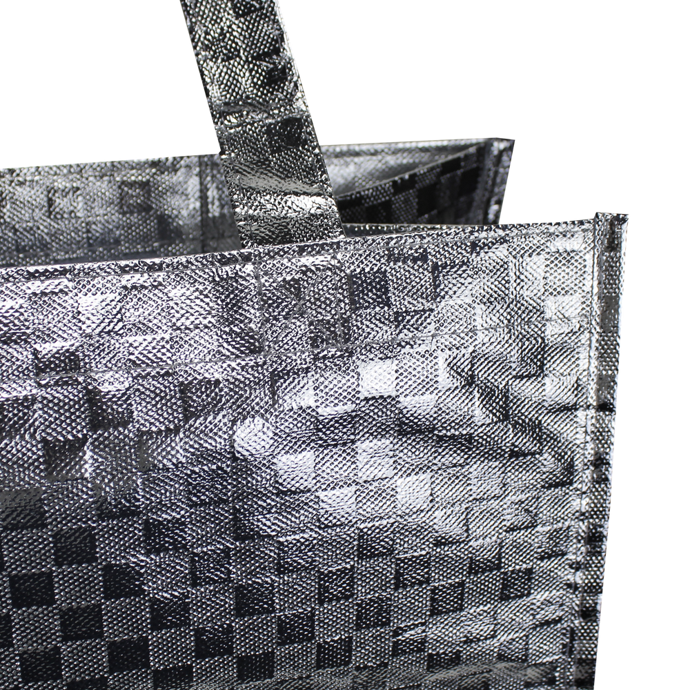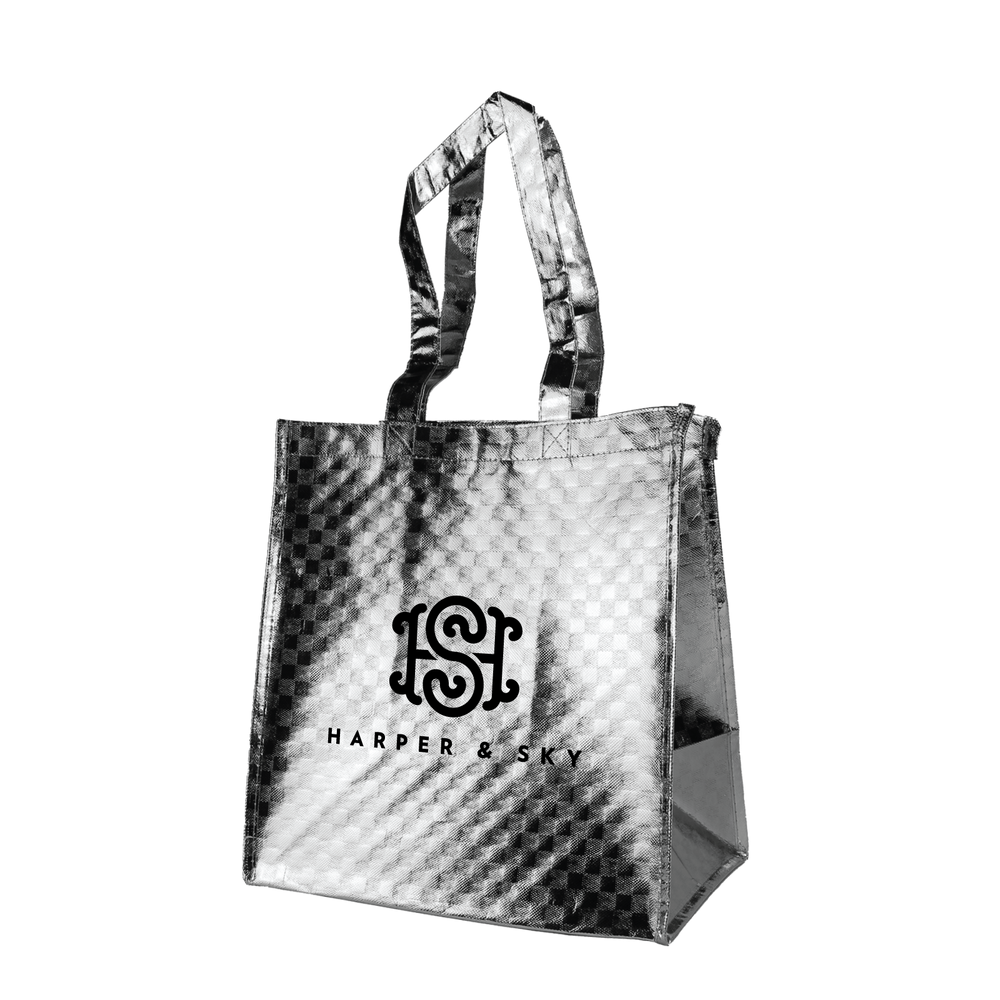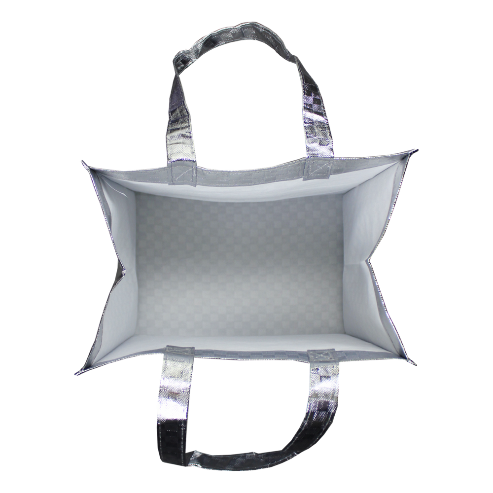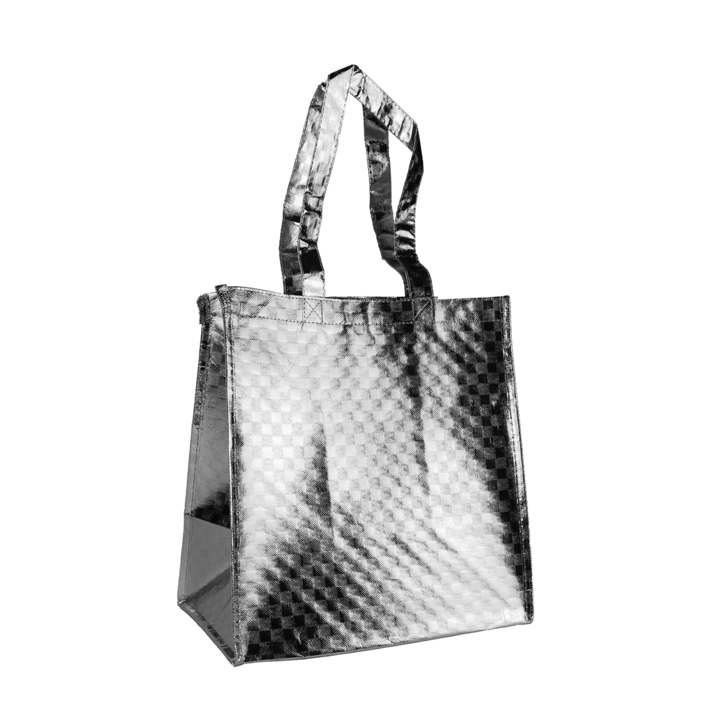 Available in a metallic, checkered pattern, this customizable tote measures 12” W x 13” H, and includes eight inch side gussets for ample storage space. The perfect bag for groceries, trips to the beach, tradeshows, or any other occasion, this durable bag features a dazzling design with a smooth finish that can be imprinted with your own custom artwork. Company logos or event information may be added to 1 or 2 sides for a personalized finish that your customers are sure to love!