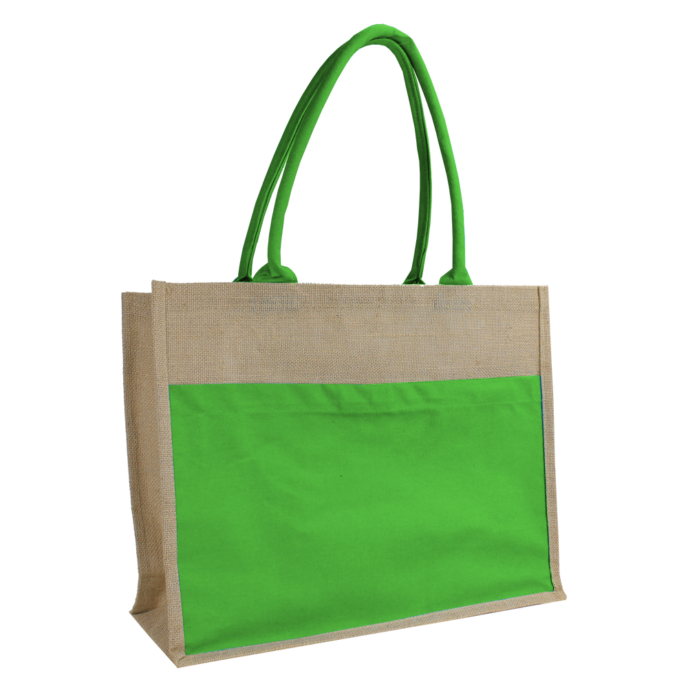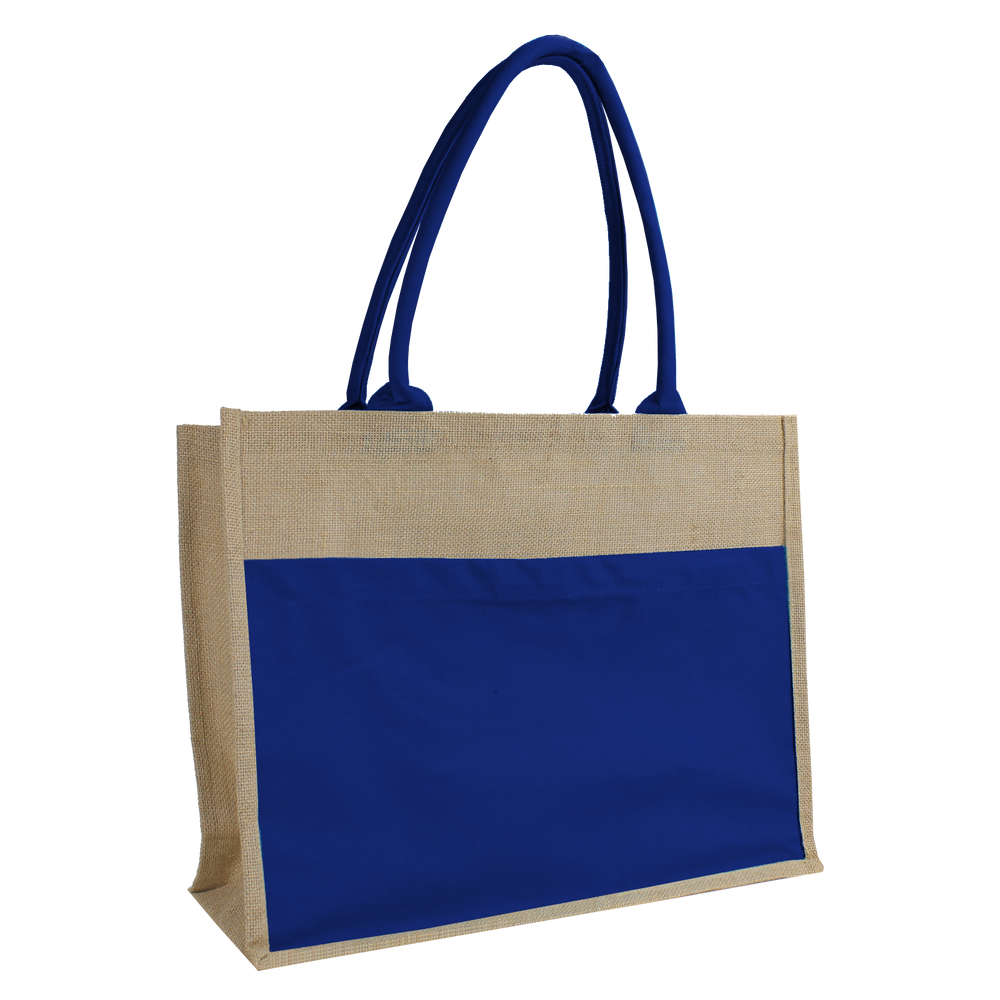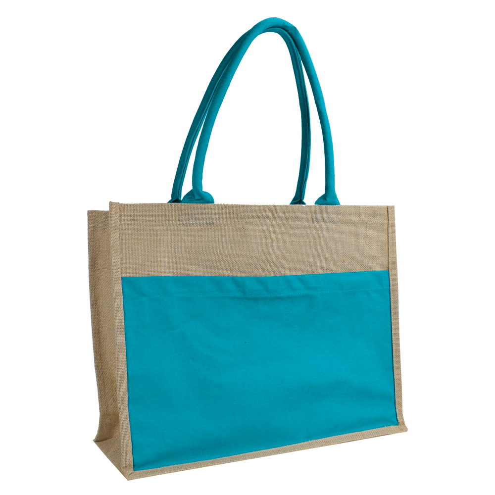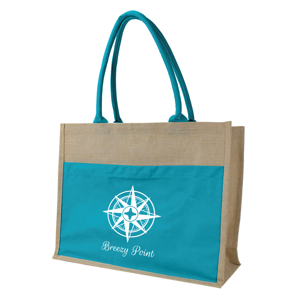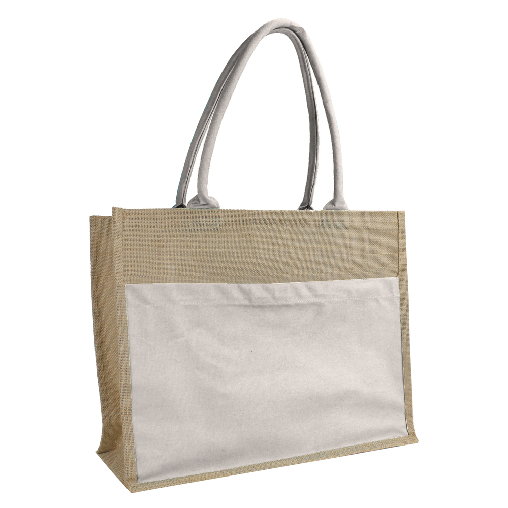 This affordable and stylish tote is made from durable organic jute fibers and features a full panel canvas magazine pocket, designed as a backdrop for your screenprinted or embroidered logo. At 18" x 14" x 6", the tote easily holds two large towels and is comfortable to carry. The velcro closure on top secures towels and other beach or pool items. Customize your Organic Jute Canvas Tote today and get free shipping.