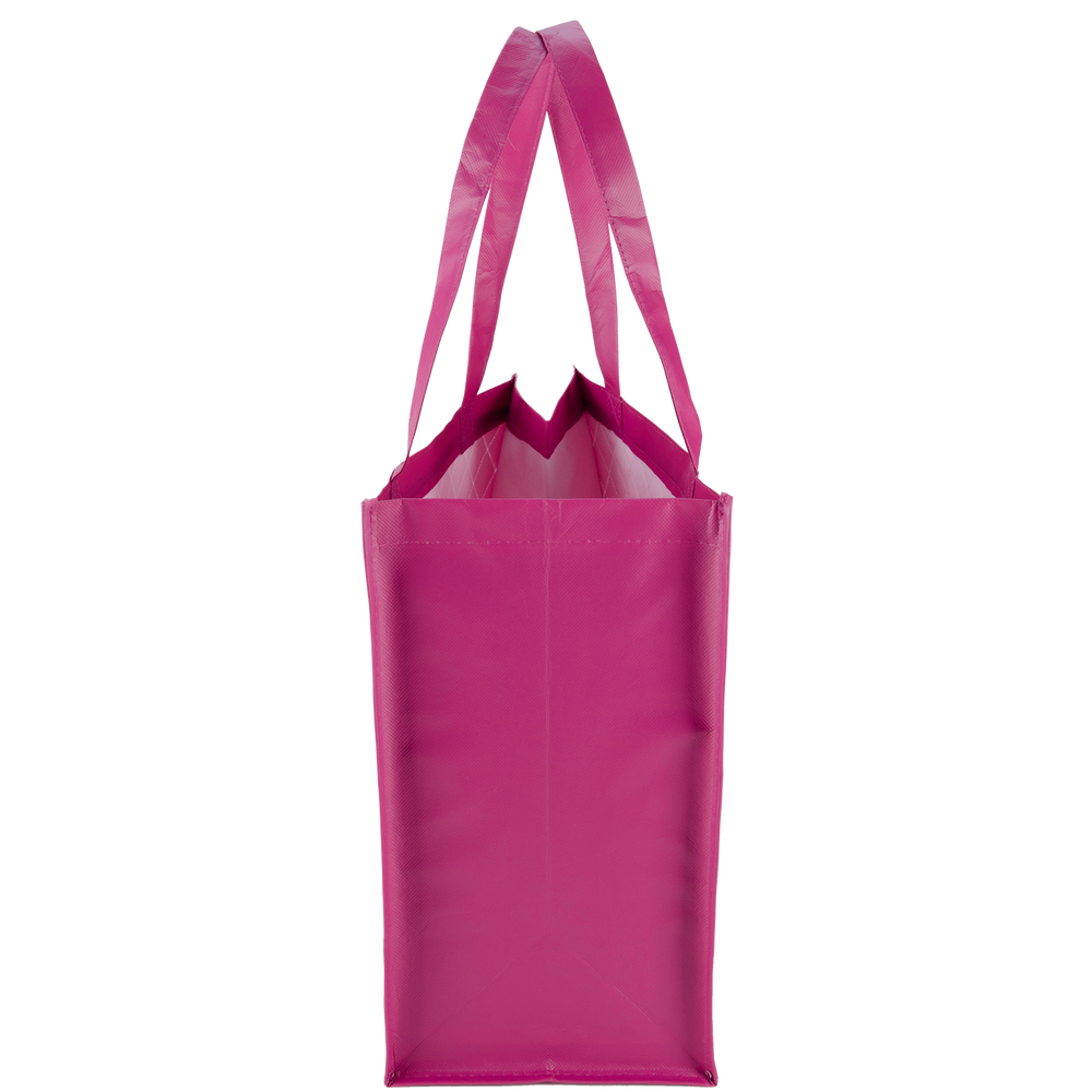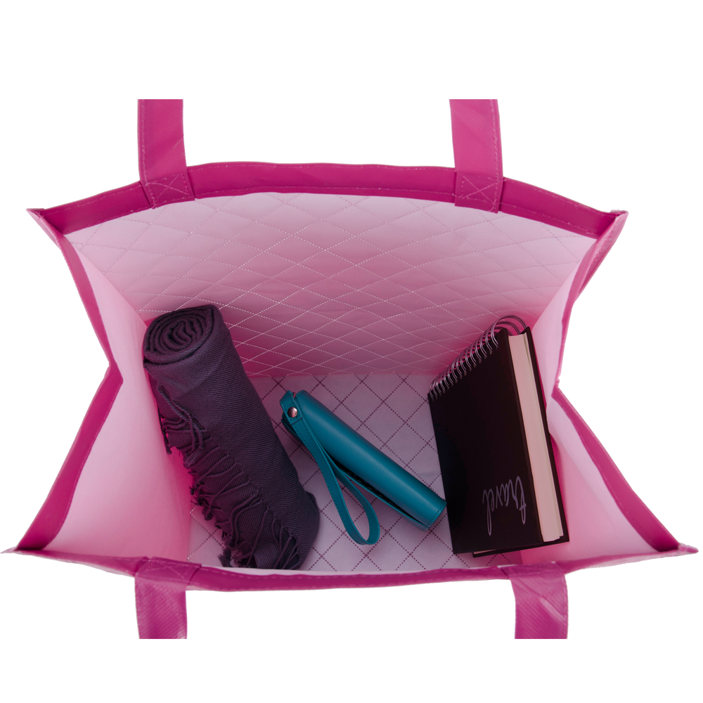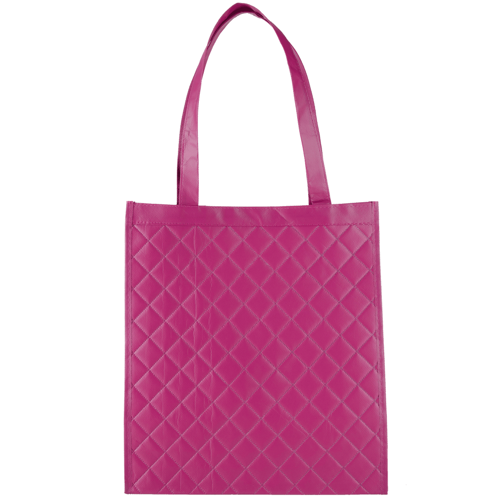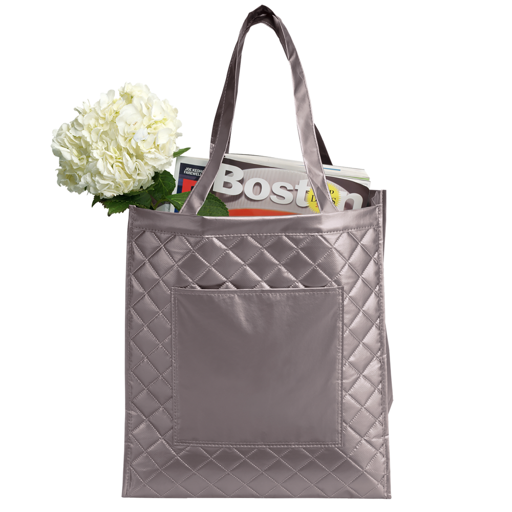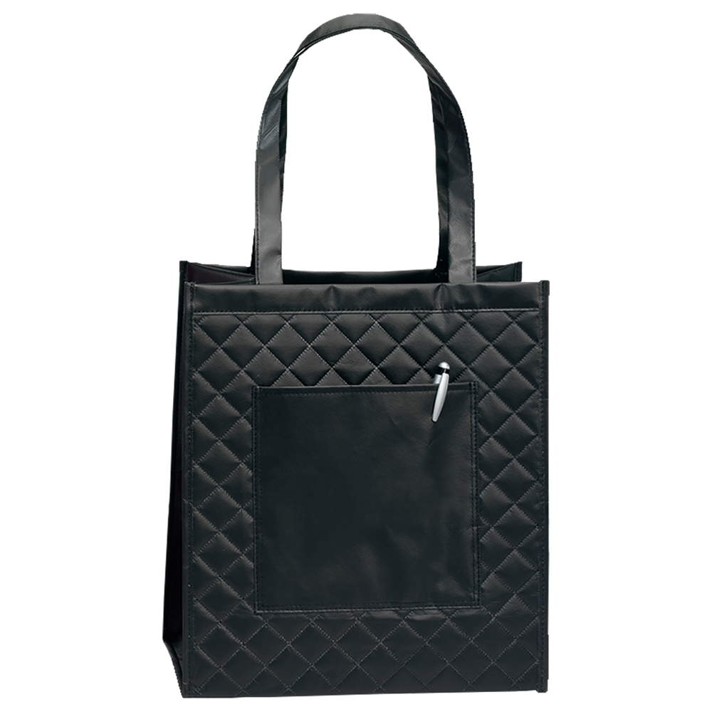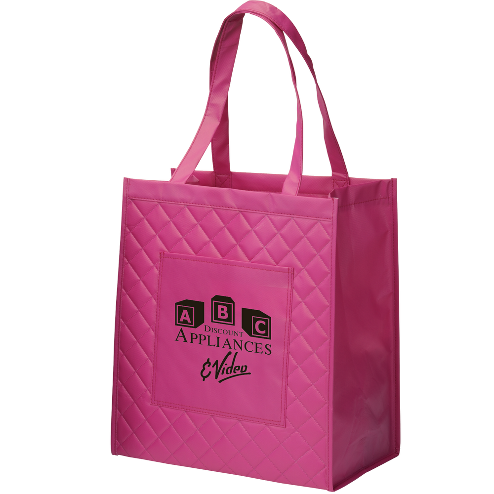 Designer-inspired quilted tote bags offer an eye-catching way to have your important advertising messages noticed. These elegant reusable grocery bags come with reinforced handles, easy-clean laminated non-woven materials, and a spacious outer pocket for cell phones, wallets or shopping notepads. Our ‘Urban Tote Bag’ quilted styling is perfect to use for trade show giveaways, organization fundraiser campaigns, and as team member personalized carryalls. Custom quilted bags are very desirable items today in fashion-conscious circles. Our lots of reusable wholesale shopping bags are carefully constructed consumer items that are designed to last for many years. The ‘Urban Tote Bag’ offerings come in shades that will never look dated; corporations can purchase their eco-friendly shopping bags in lot sizes that will accommodate more than one season of distributions.
