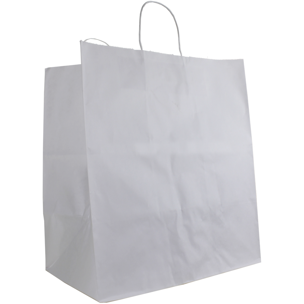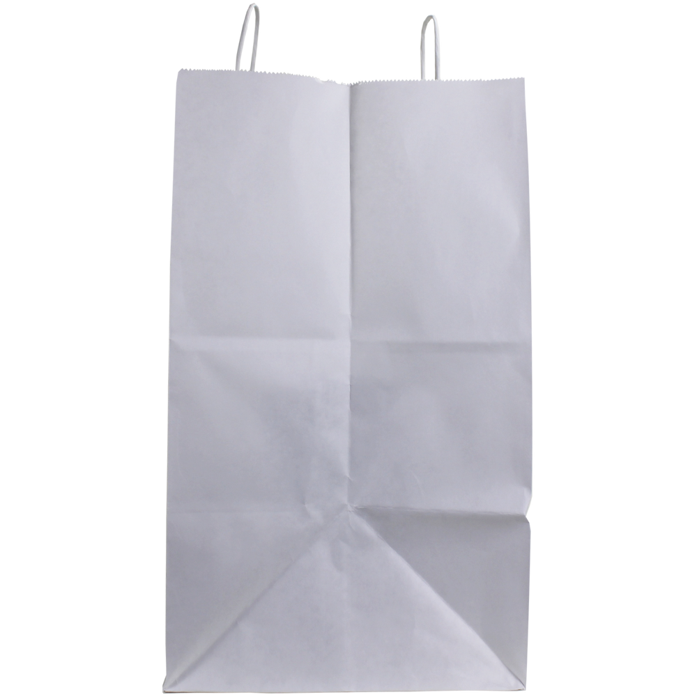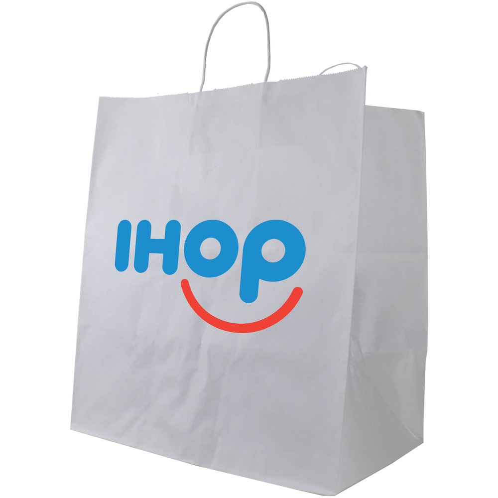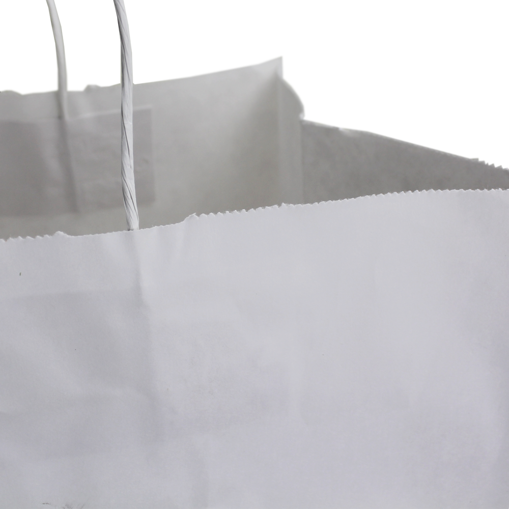 Search our selection of custom printed white paper bags. These extra-large white paper bags are a perfect size for restaurants or other food businesses. This recyclable paper bag will show the full extent of your logo whether it’s a fully designed vector art image or just text. We also offer free design services to help you create a design if you don’t have one. A low wholesale pricing is available to anyone who can reach the low minimum order amounts. These recyclable paper bags with paper twisted handles are good for takeout, food businesses, and a variety of other uses.