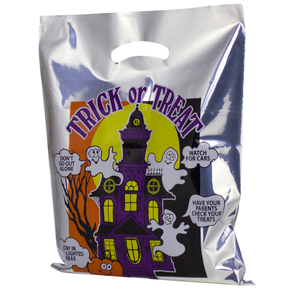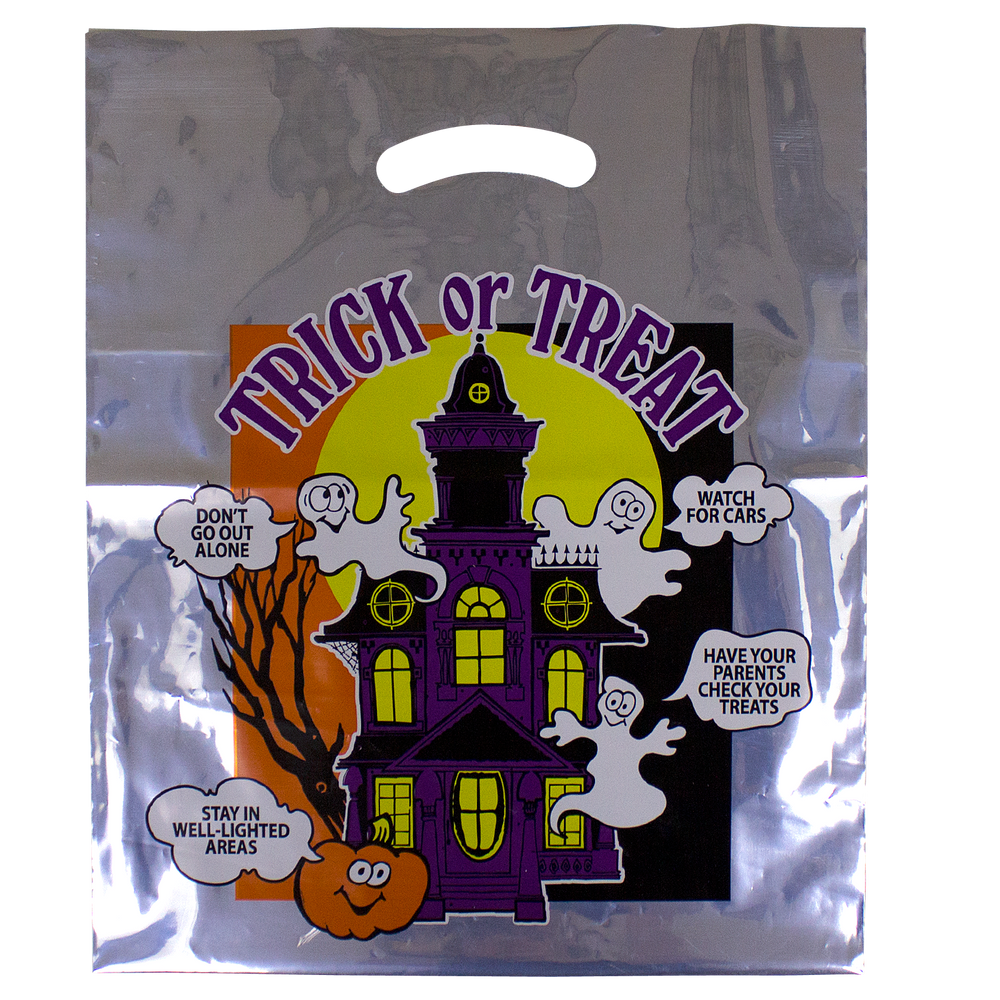 Silver haunted halloween bags that includes safety tips. Imprint on back only. Tips include "Don't go out alone", "Watch for cars", "Have your parents check your treats", and "Stay in well lighted areas".