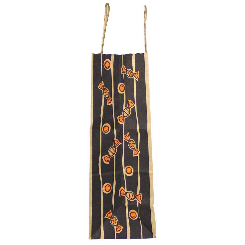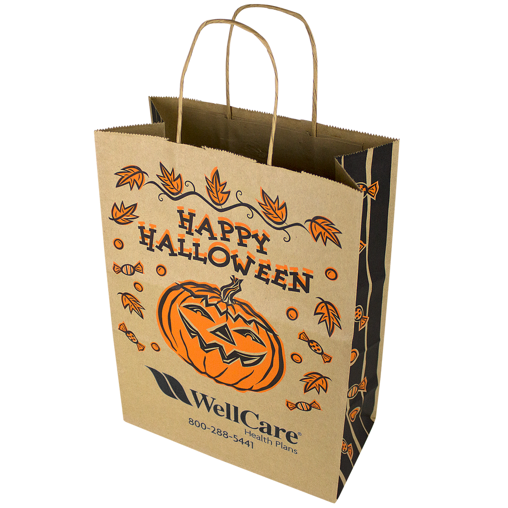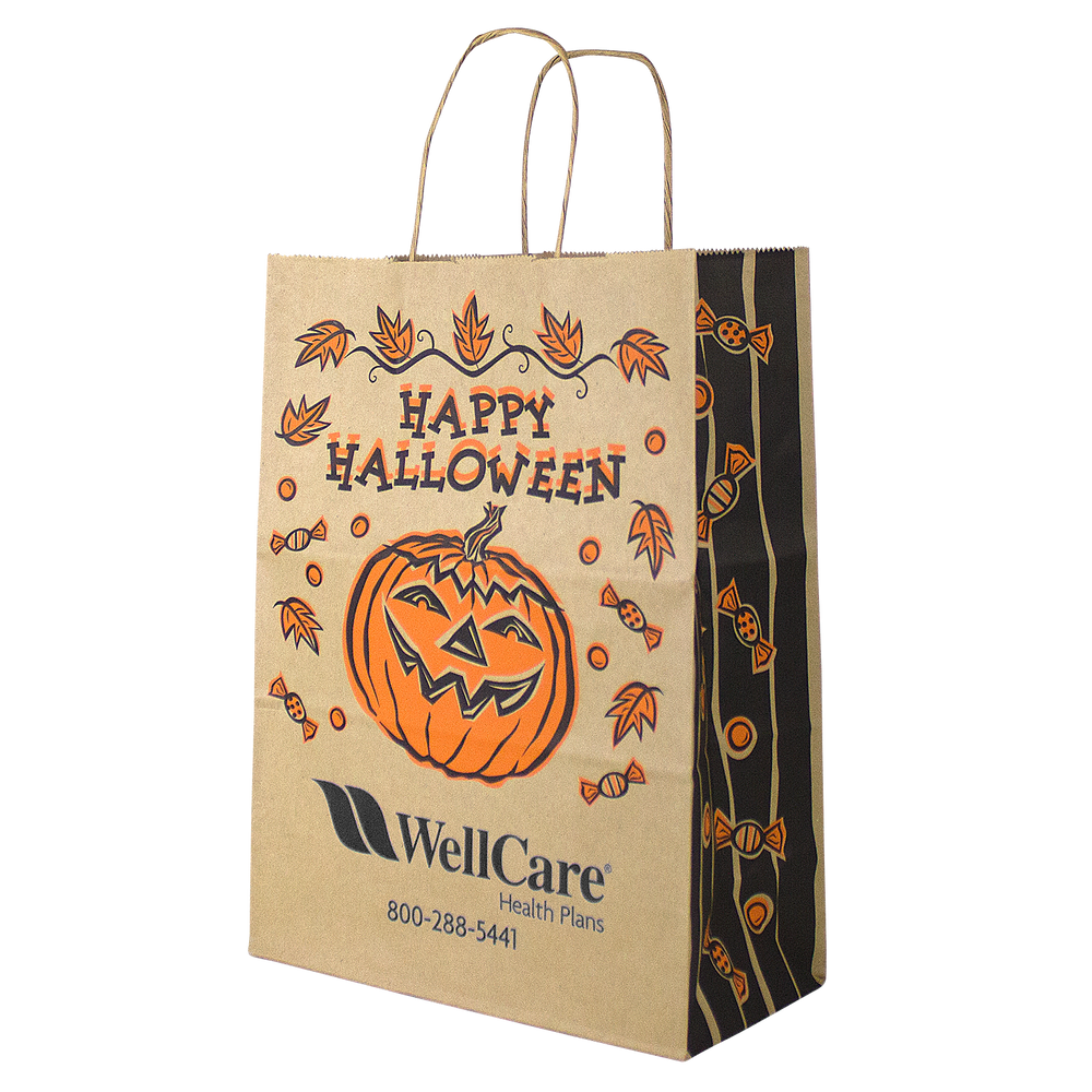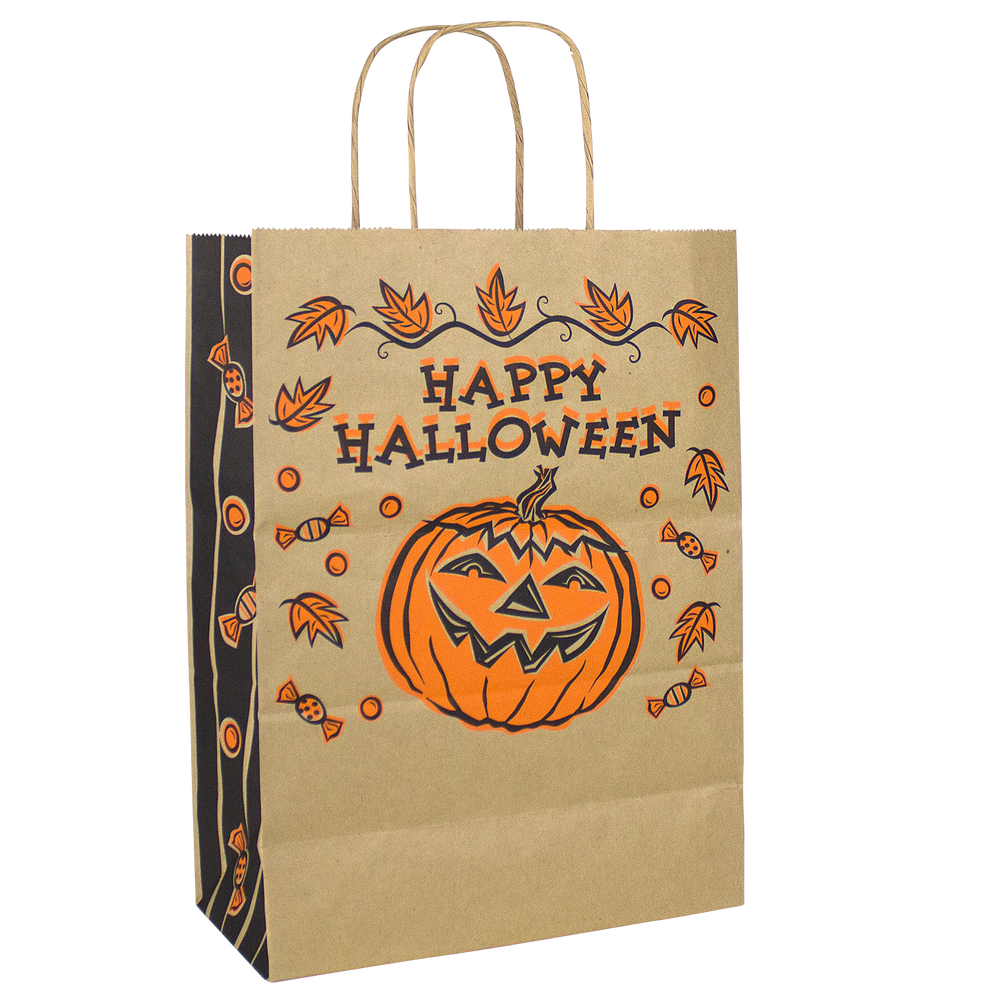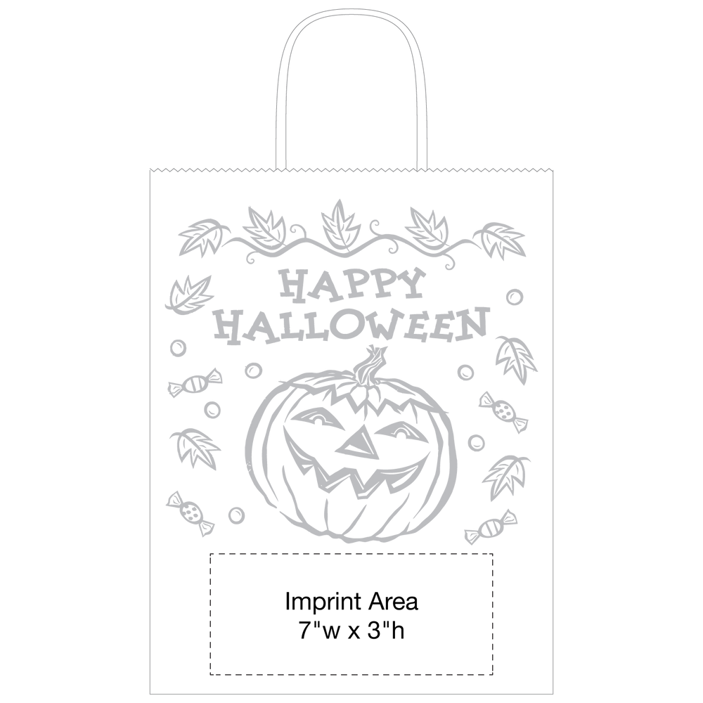 This Kraft Paper Halloween Bag is a great choice to offer for Halloween this year. The stock design has a jack-o-lantern on the front with "Happy Halloween" written above it. The imprint area is just below the design where you can put your 1 color imprint in black on the front. This Halloween Kraft paper bag is made of durable paper with a serrated top and matching twisted paper handles. It also has generous 5" gussets. Get your brand out there this year with the playful Kraft Paper Halloween Bags from Holden Bags.