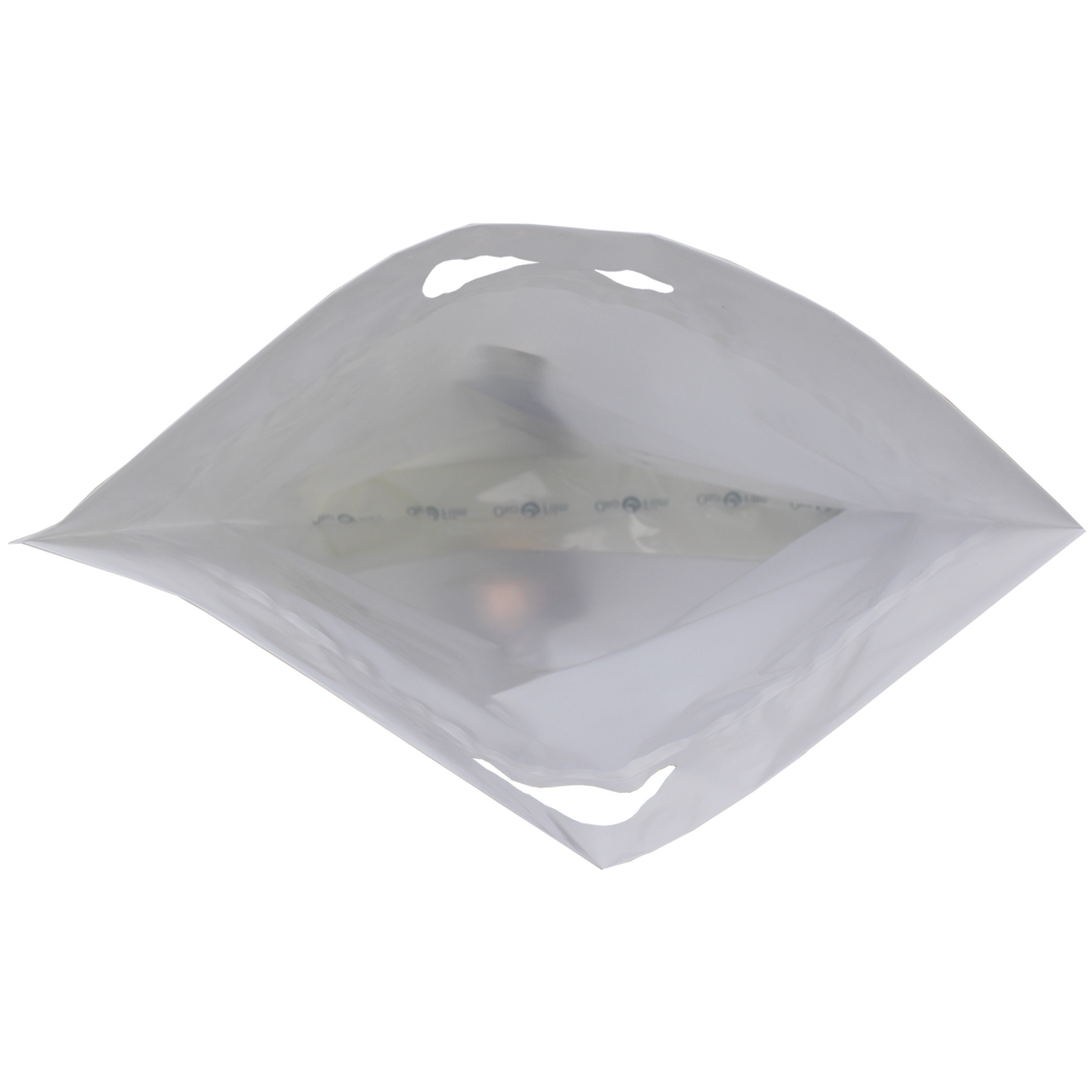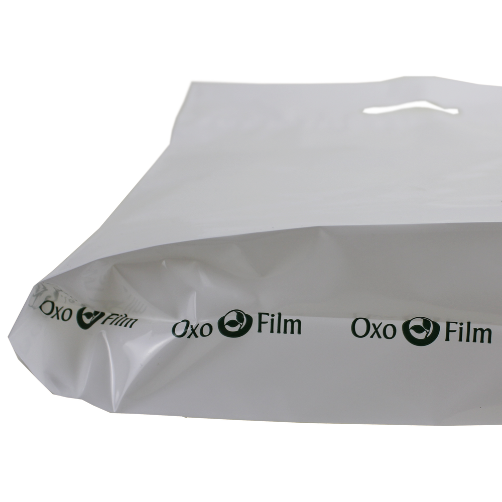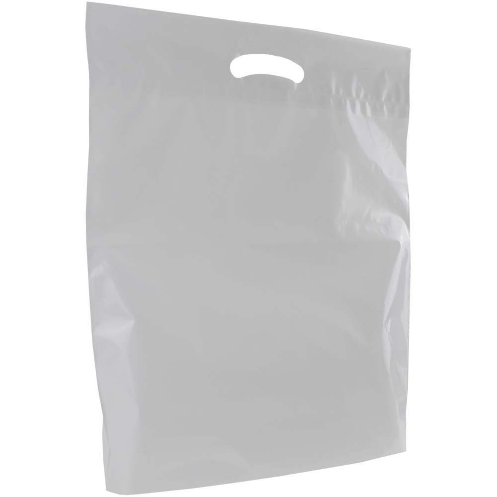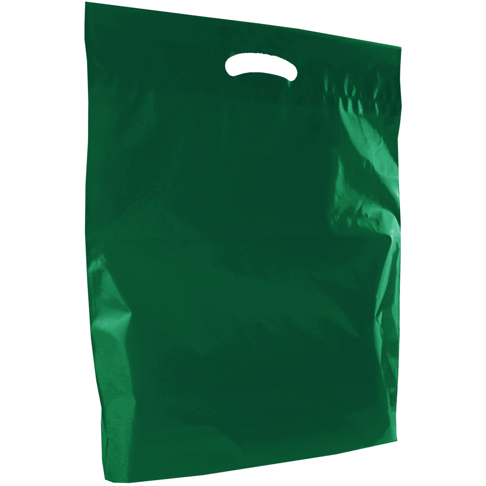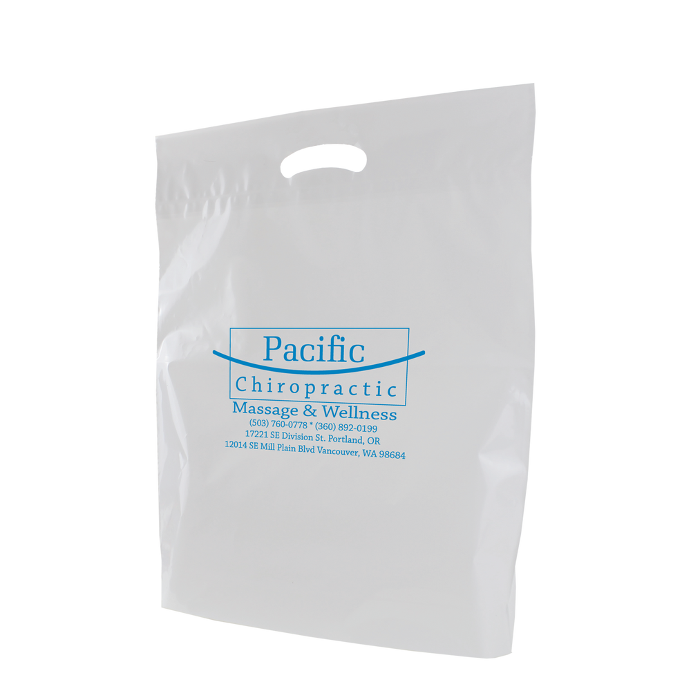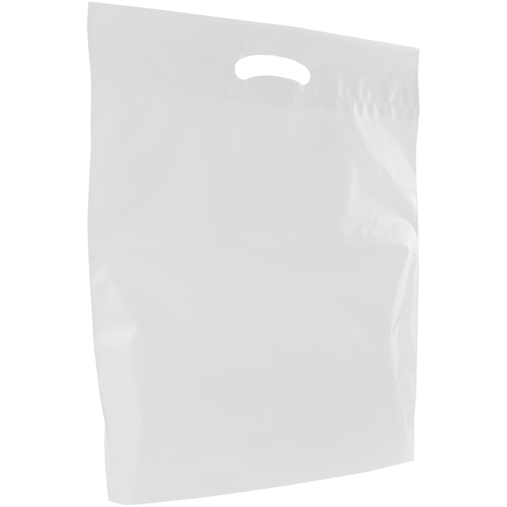 Browse and purchase from our range of custom printed die cut plastic bags. These large die cut eco-friendly plastic bags have reinforced handles and are both recyclable and biodegradable. After the bag is thrown out, subjection to the elements will biodegrade the die cut plastic bag. It’s recommended that you use these plastic die cuts bags within a year and store them in a climate controlled area. Made up of low density film these large die cut plastic bags come in white, clear frost, and lime colors. These die cuts bags would be perfect for businesses, conferences, school events and more. If your design is a few lines of text, clip art, or a fully designed vector art image this bag’s imprint area will feature your design great. We also offer free design services to help you create a design if you don’t have one. Take advantage of our wholesale pricing available to anyone that can meet the low minimum order requirement. Shipping is free on all orders, so get your eco-friendly large die cut plastic bags today!