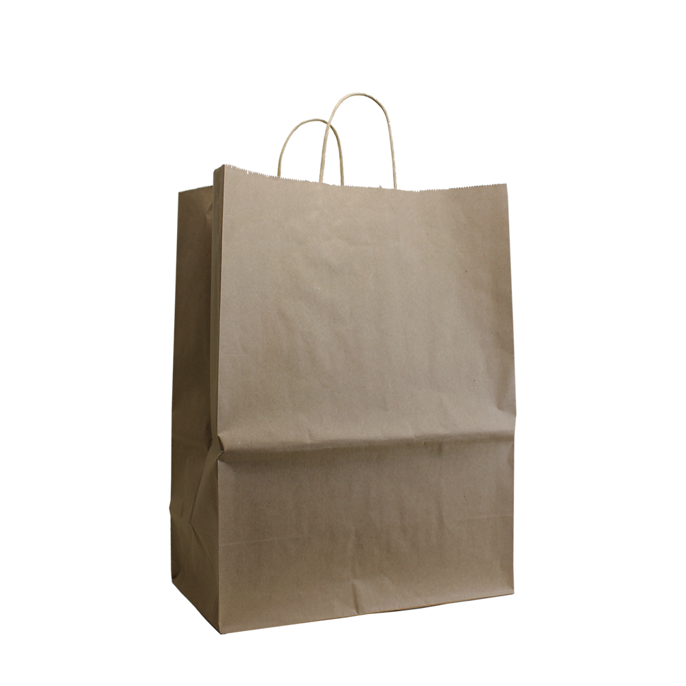 Our Large Kraft Paper Shopper Bags are perfect for retail stores, restaurants grocery stores, and more! Their 13" W x 17" H x 7" Gusset size makes them practical for carrying almost anything including clothing, groceries, and other goods. These bags are made from 100% recycled natural kraft paper and can be reused or recycled when you're done with them. This bag can be customized with the logo, message, or artwork of your choice.