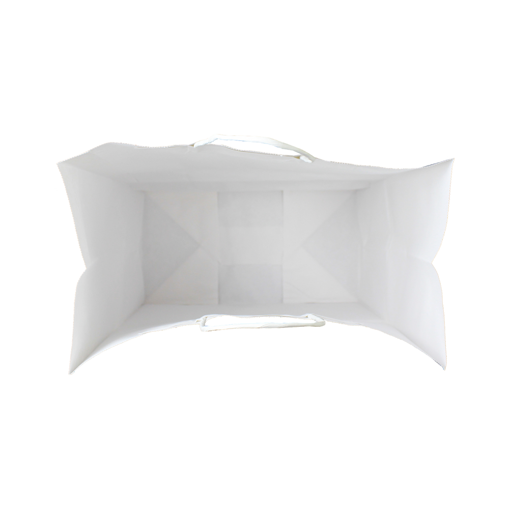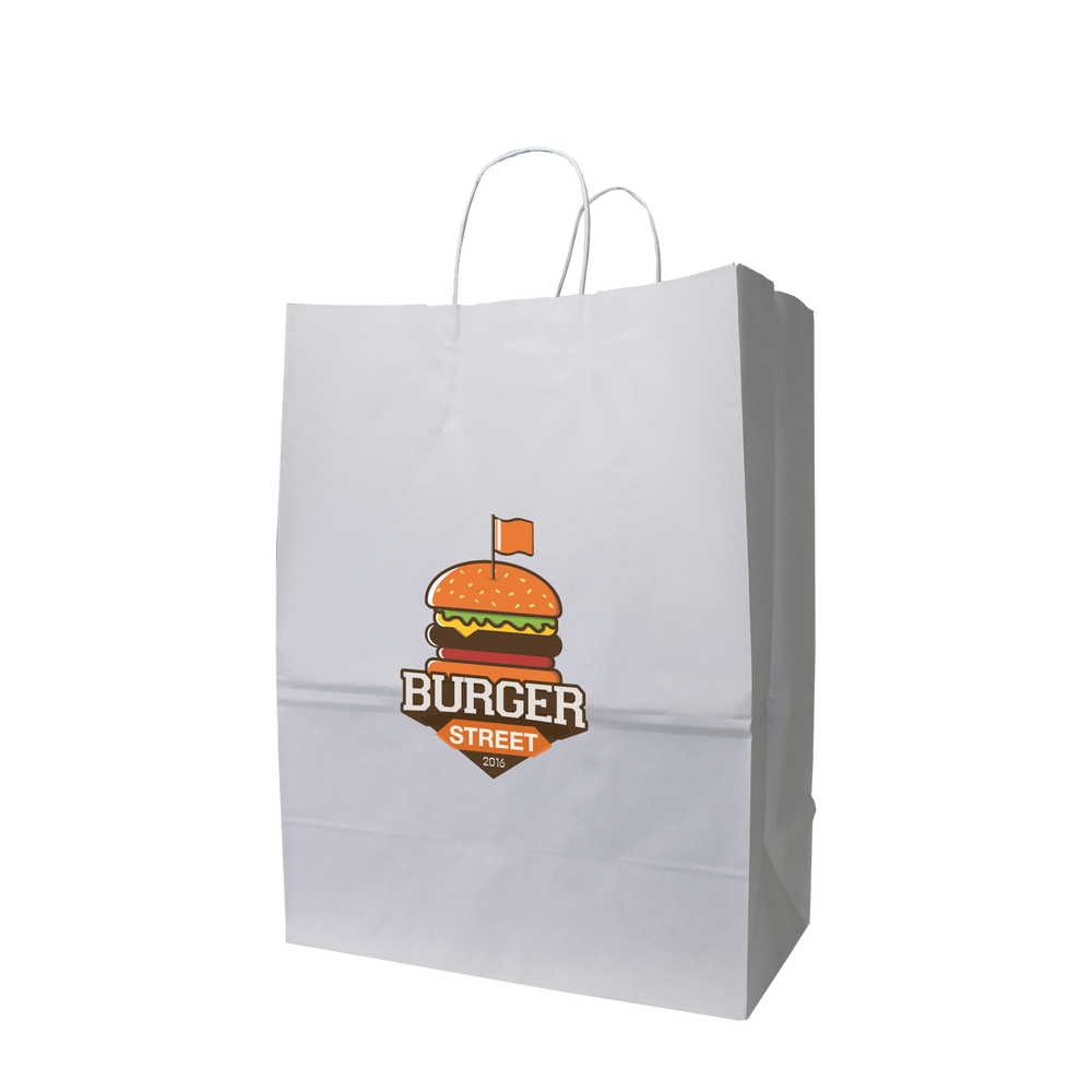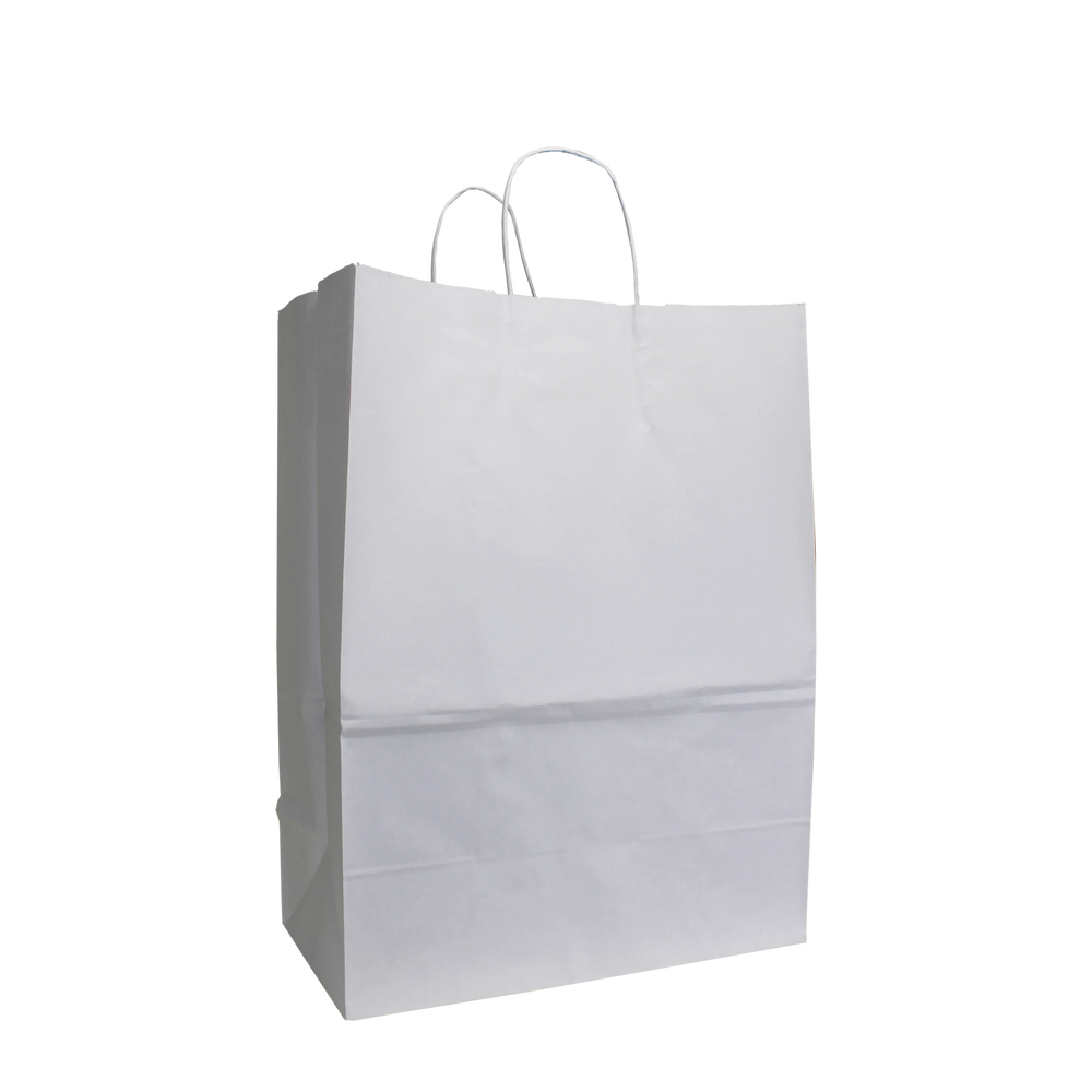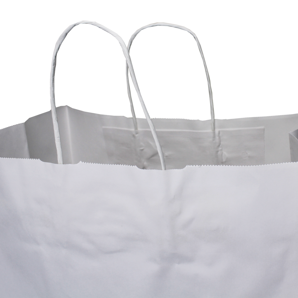 Our Large White Paper Shopper Bags are perfect for retail stores, restaurants grocery stores, and more! Their 13" W x 17" H x 7" Gusset size makes them practical for carrying almost anything including clothing, groceries, and other goods. These bags are made from 100% recycled natural kraft paper and can be reused or recycled when you're done with them. This bag can be customized with the logo, message, or artwork of your choice.