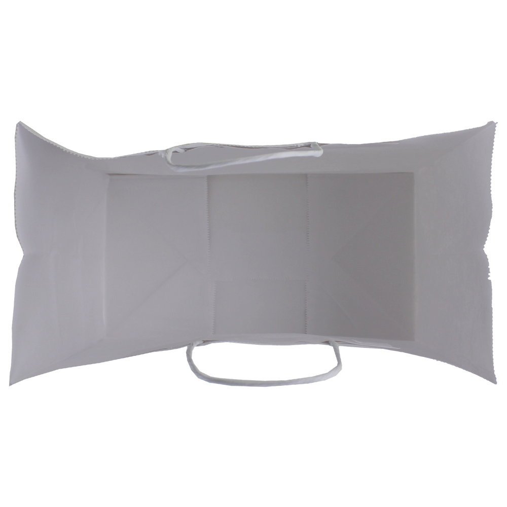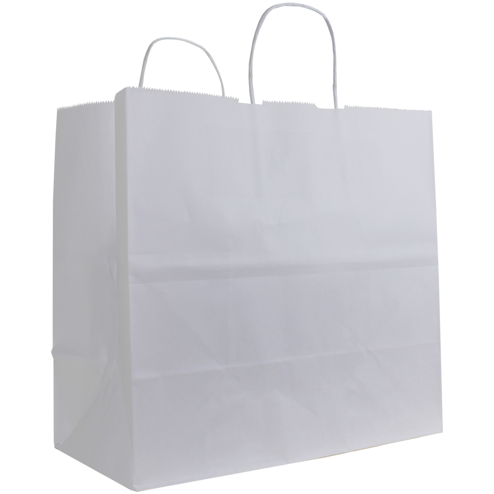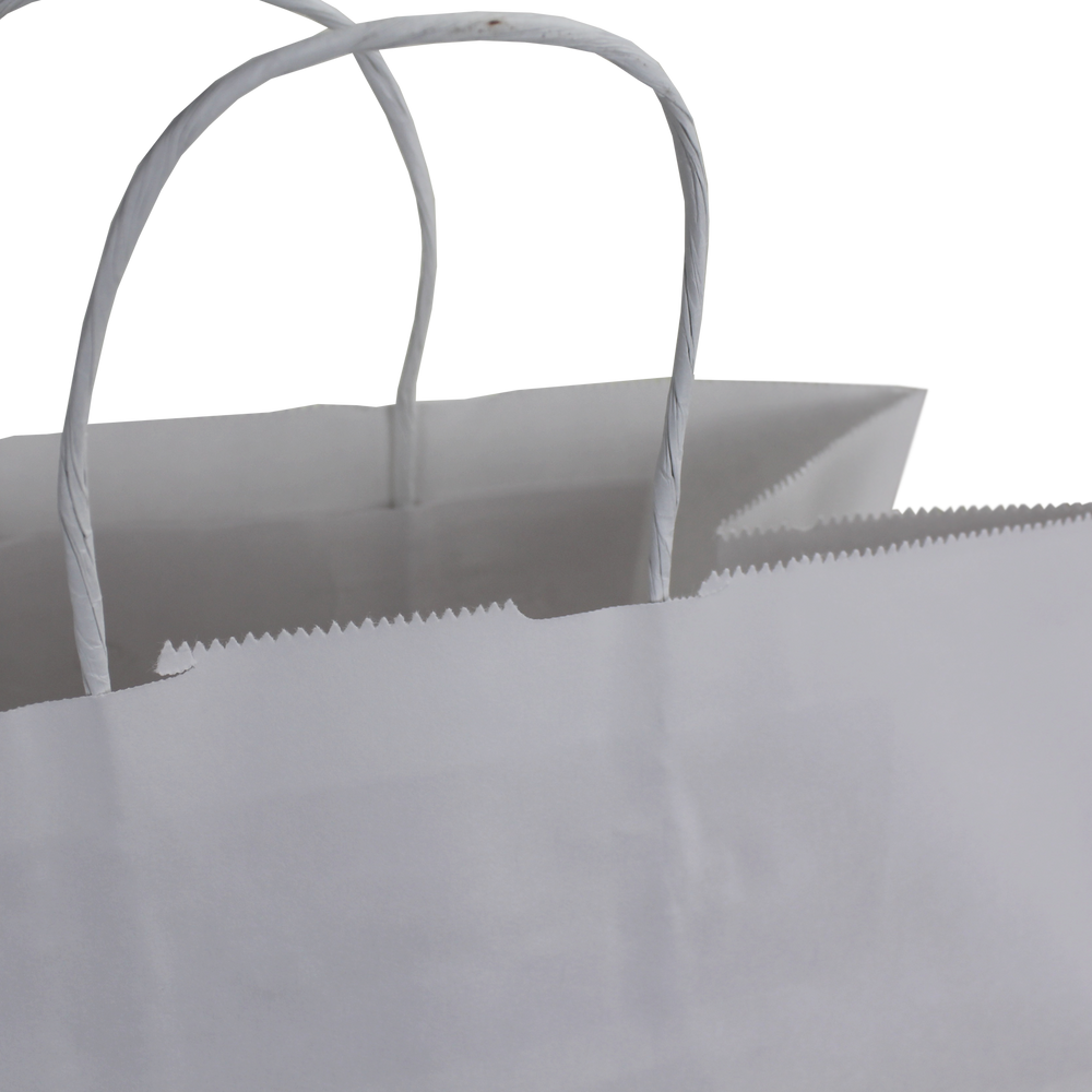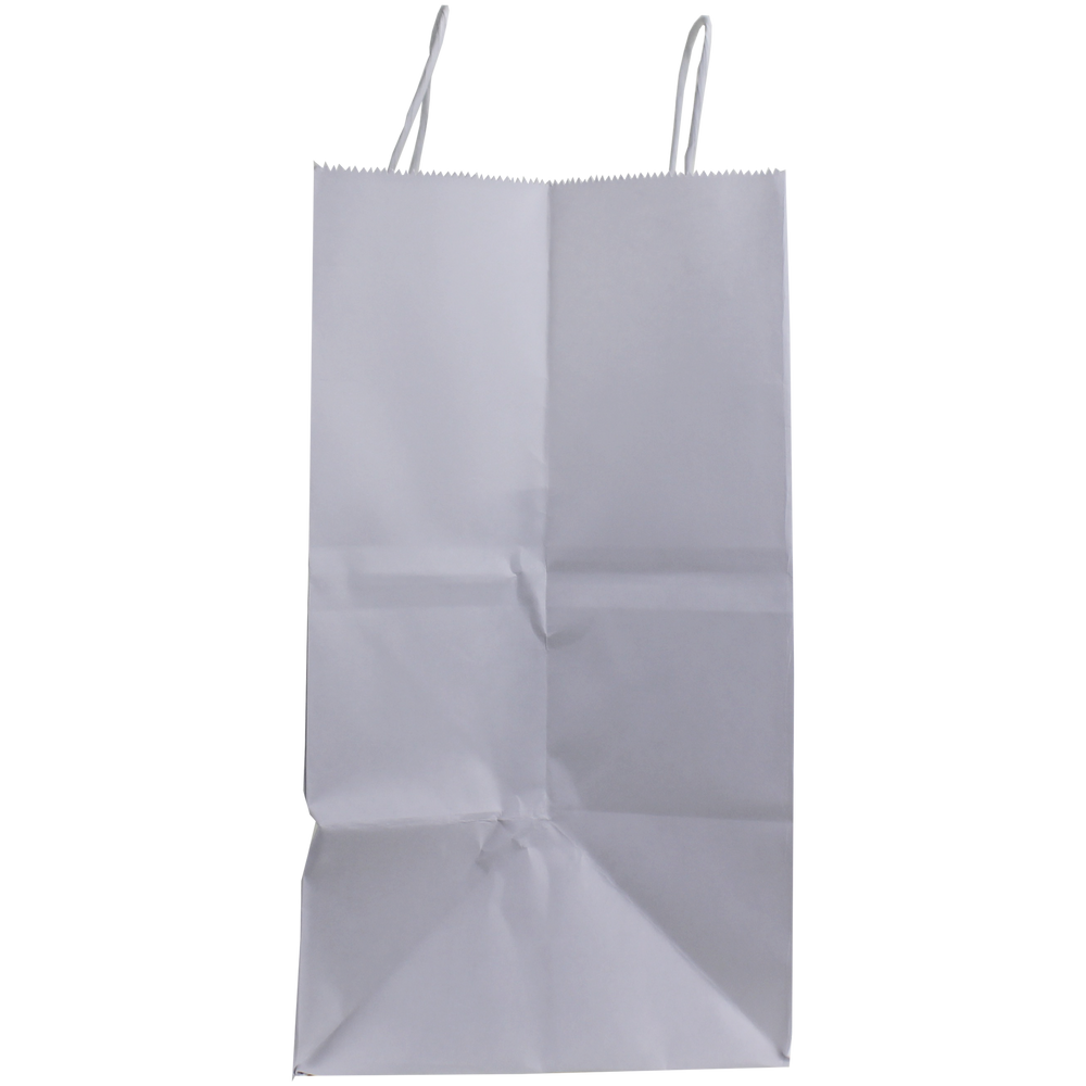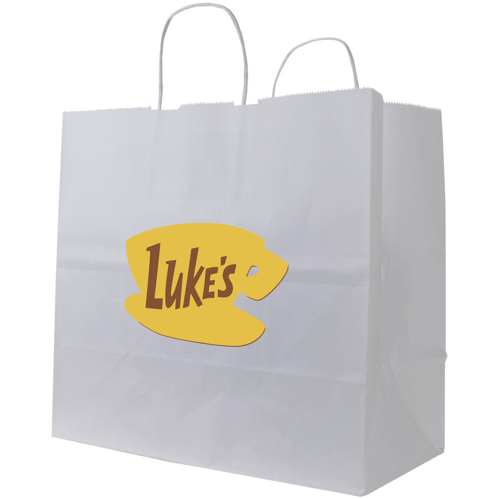 Survey our selection of custom printed white paper bags. These white paper bags are a convenient size for carrying takeout or for use in a small store. With a sizable imprint area this recyclable paper bag will let you show the full extent of your logo whether it’s just text or a fully designed vector art image. We also offer free design services to help you create a design if you don’t have one. These recyclable paper bags with paper twisted handles are good for takeout, use in stores, giveaways and more. A low wholesale pricing is available to anyone who can reach the low minimum order amounts.