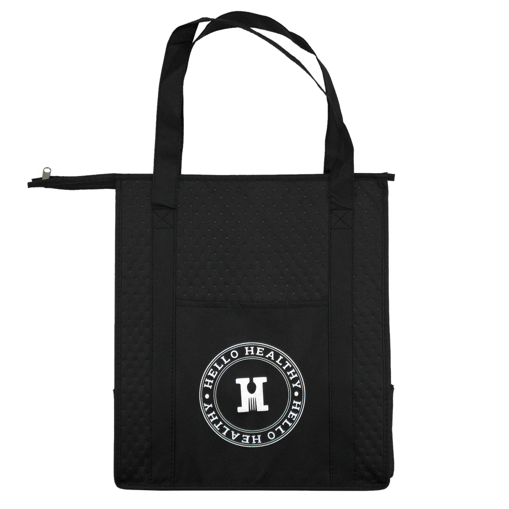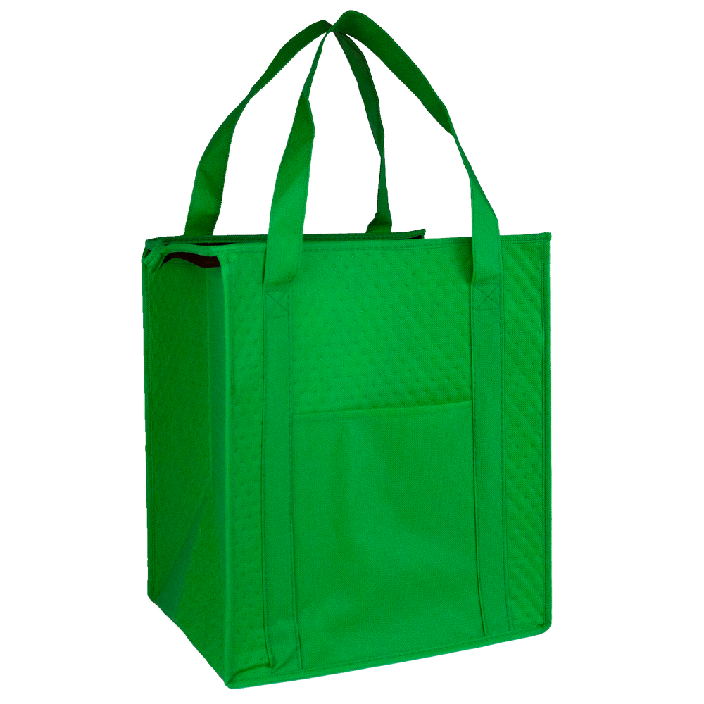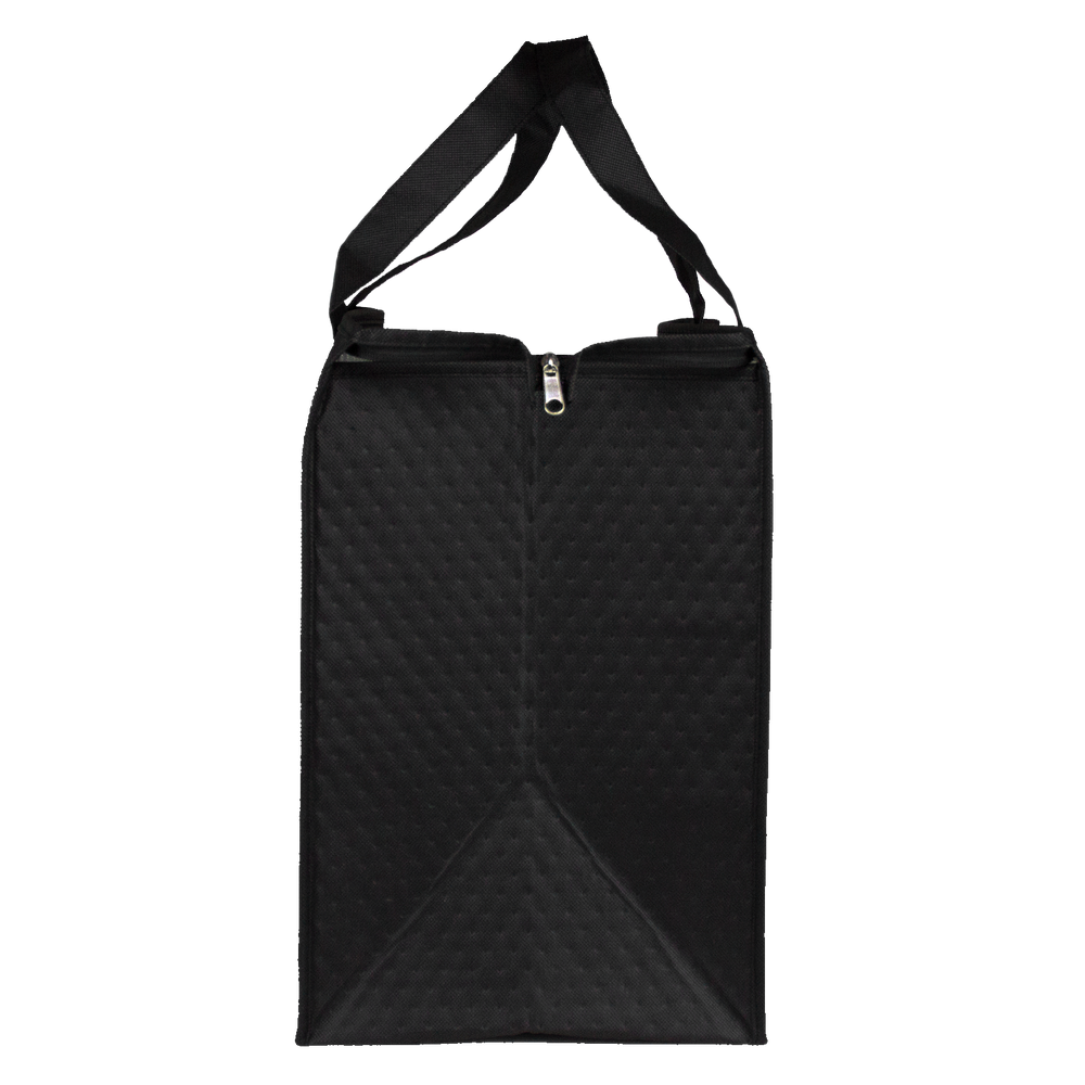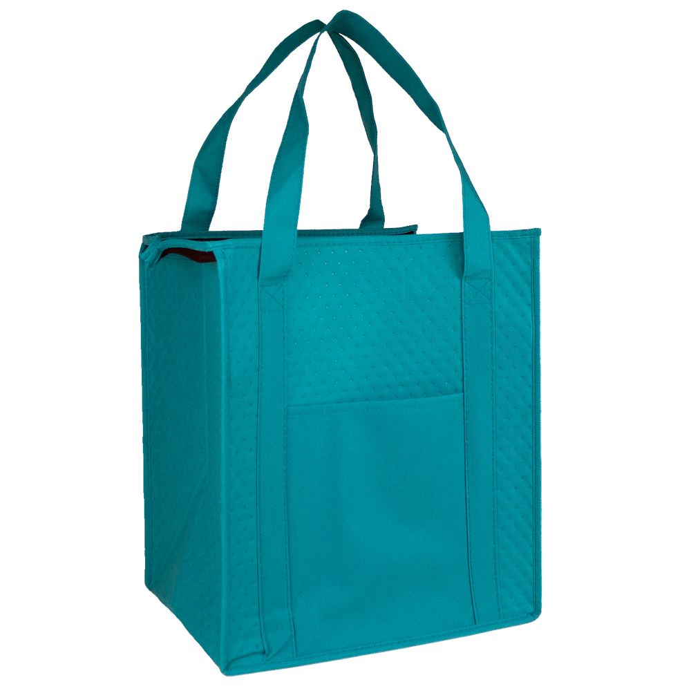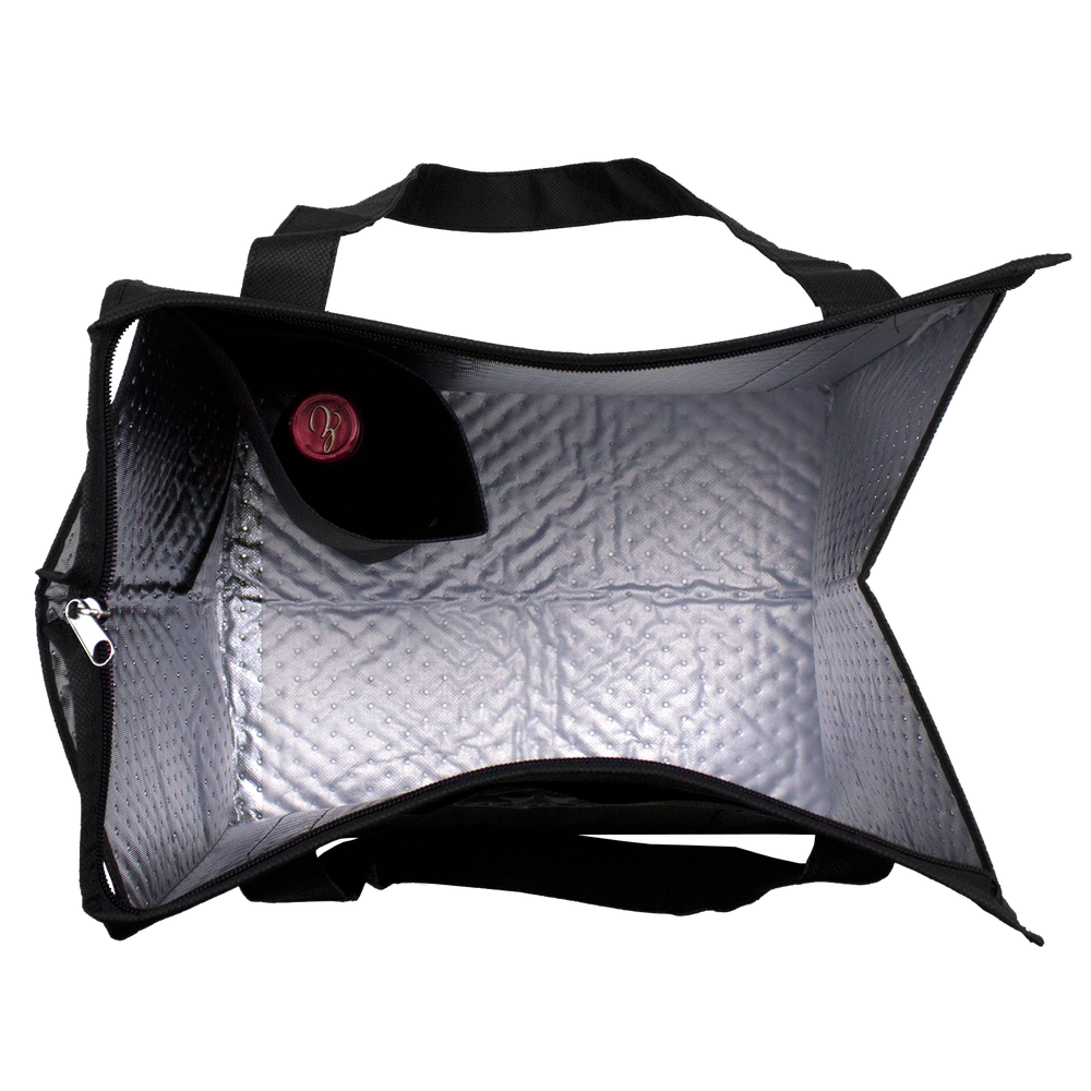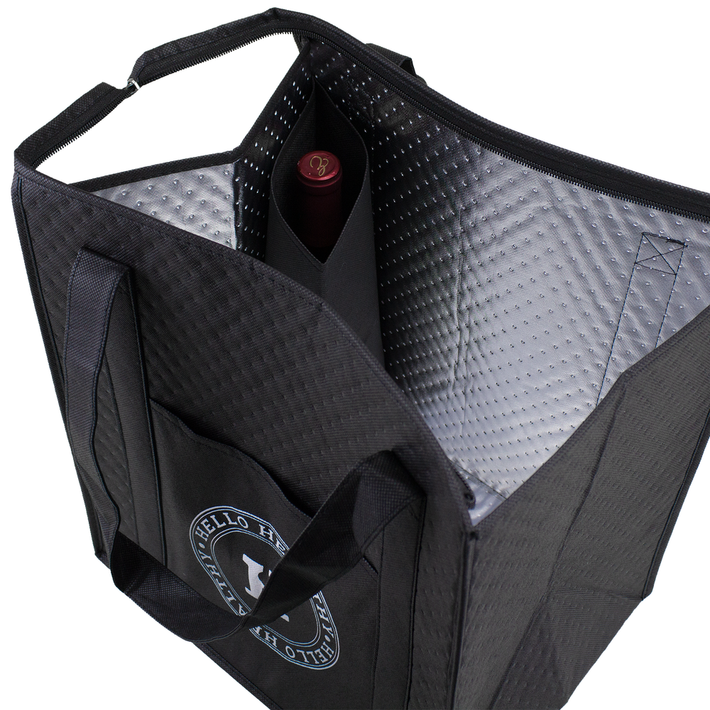 Our Pocket Insulated Tote has a new and improved design. It now has an Interior bottle holder to keep your bottle in place. The bag has handles sewn completely around the bag providing superior strength. It uses a zipper closure around three quarters of the bag. It's sturdy construction and reinforced handles are meant to support items that need to stay cool or hot for extended periods of time. There is a convenient pocket as well in the front of the bag to keep other items in outside of the cooler area.