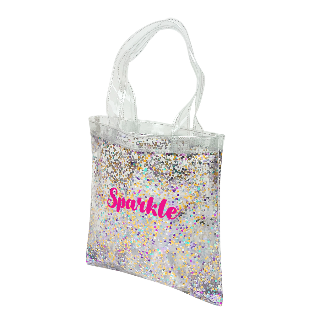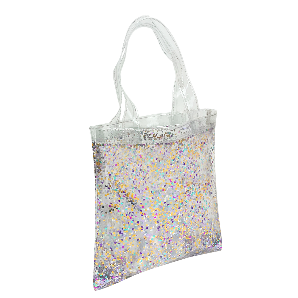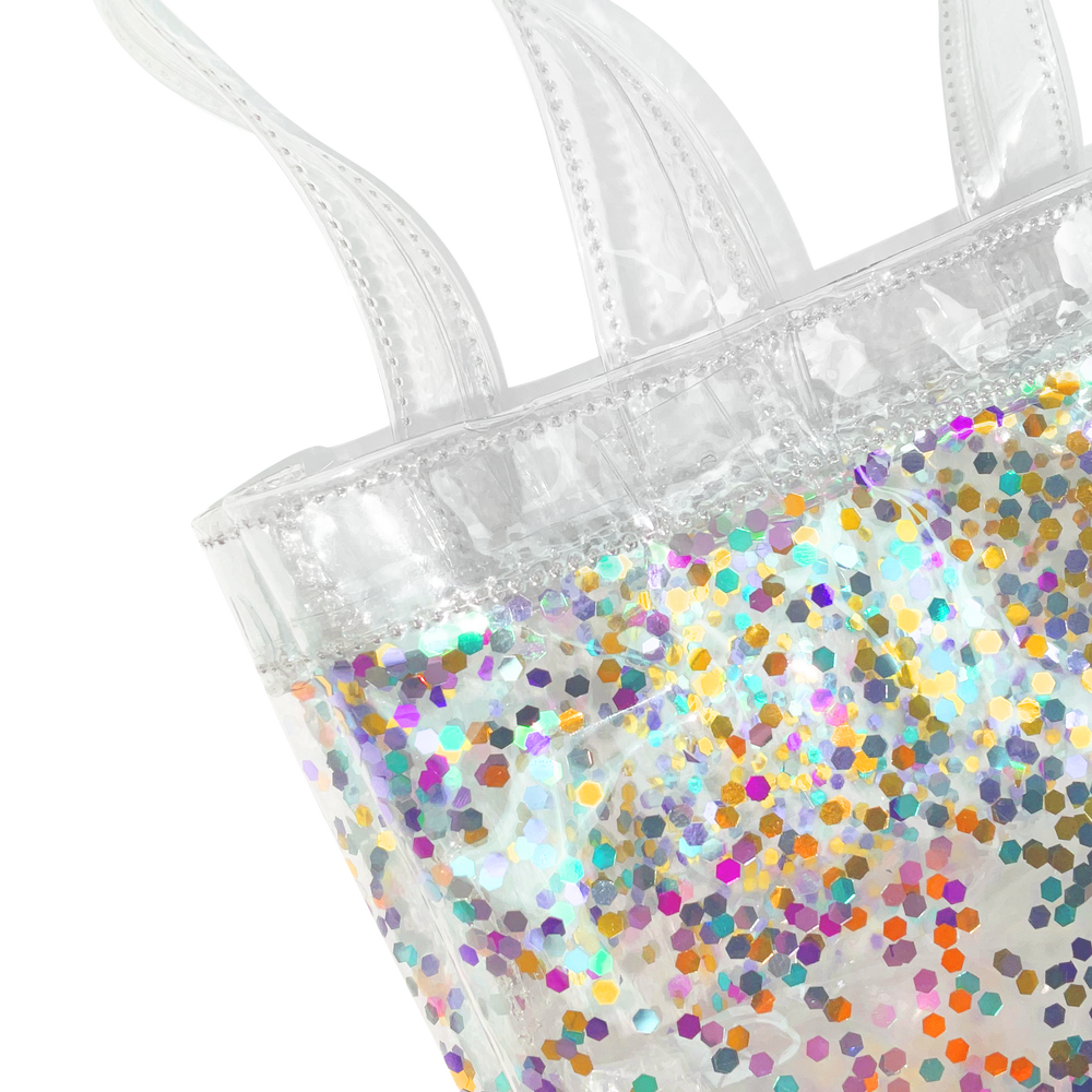 Spread some color and sparkle with our small confetti tote bag. This clear vinyl tote bag features bright, moving confetti that’ll capture attention and be the talk of the town. With your logo on this small confetti tote bag, you, too, can be the center of conversation. This short tote, with a size of 10” W x 11” H, can hold everyday essentials and a full side imprint area. Showcase your brand or logo in front of the rolling confetti vinyl, perfect for single-color designs to stand out. Customize and order your small confetti tote bags today!