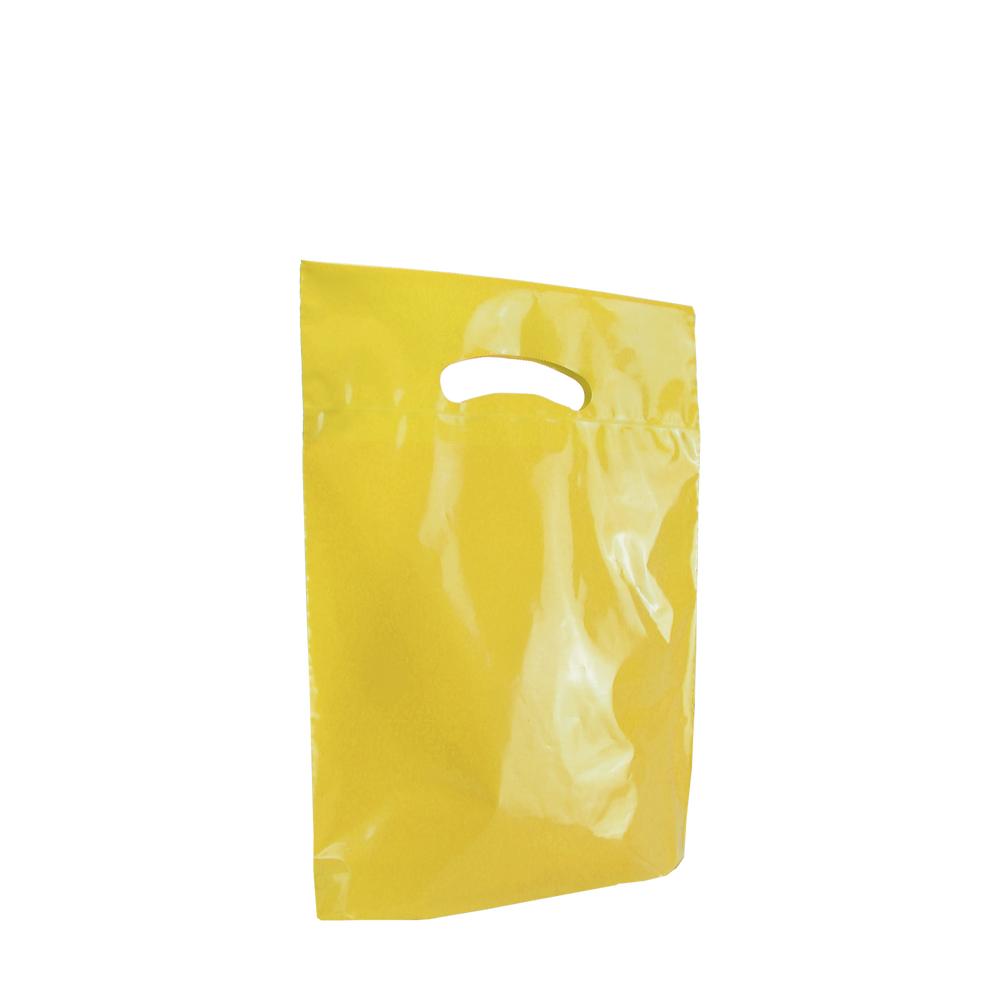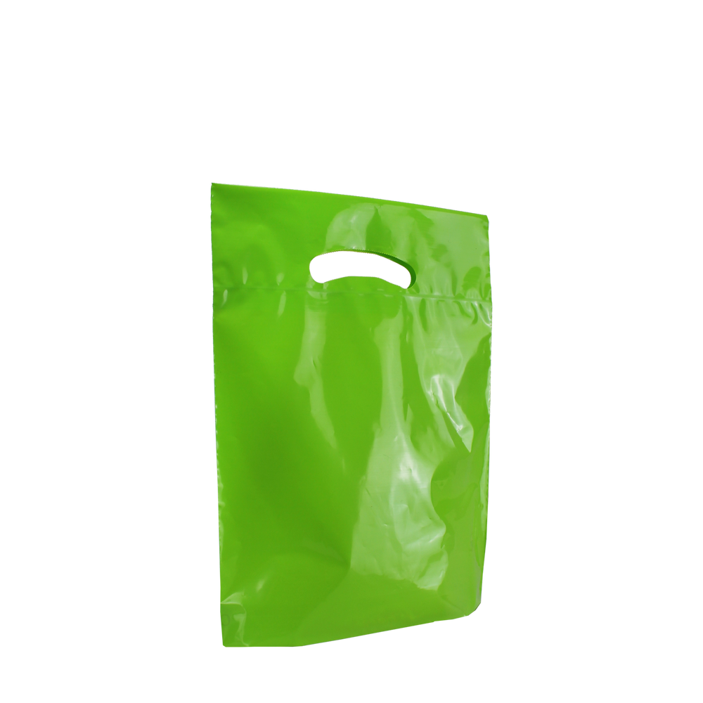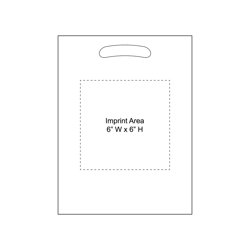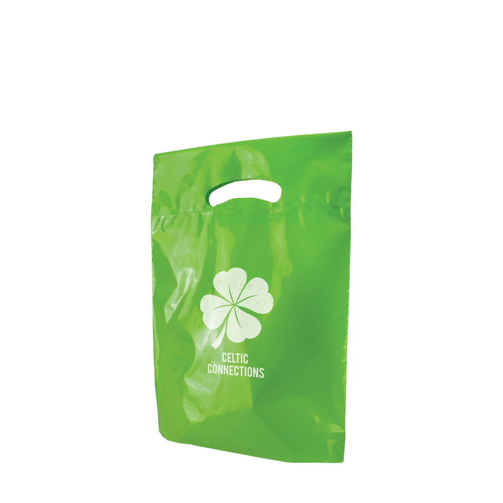 Our Small Eco-Friendly Die Cut Plastic Bags measure 9" W x 12" 5 with a 2" Gusset, making them ideal for packaging and carrying small items like books, clothing, food items, and more. This bag can be customized with a 6" x 6" imprint of your choice. Made out of 100% recyclable materials, this bag is not only good for your business, but also good for the environment.