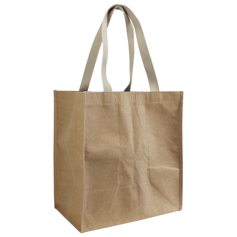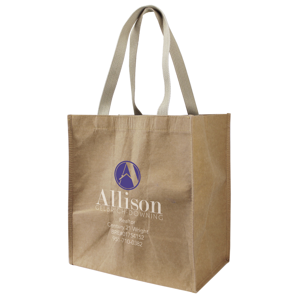 Holden Bags sells new paper bags you can wash and reuse! The washable paper little storm grocery bag is an eco-friendly bag that is made out of washable kraft paper fabric. Customize this unique bag with your logo! Make use of the ample 8” X 8” imprint area this bag gives you to show the full extent of your logo whether it’s a fully designed vector art image or just text. The washable paper little storm grocery bag is also biodegradable and recyclable, making it an eco-friendly option for your business. With reinforced handles, this bag is great for grocery trips and can now be thrown in the washer to keep the bag clean and looking brand new. Lay the bag flat to dry. Low wholesale pricing is available to anyone who can reach the low minimum order amounts. Select the Customize & Price button to decide on an imprint option, imprint color, and specifics regarding your organization. If you choose to include a logo or other brand artwork, please provide artwork instructions, and upload a file of it. You can call (800) 255-0885 or email info@holdenbags.com if you have any questions about the washable paper little storm grocery bag.